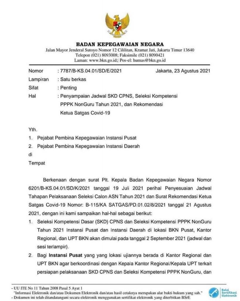 Dalam surat BKN bernomor 7787/B-KS.04.01/SD/E/2021 itu, disebutkan bahwa SKD CPNS dan Seleksi Kompetensi PPPK Non Guru tahun 2021, baik untuk instansi pusat maupun daerah, akan digelar mulai 2 September 2021. Adapun penyelenggaraan ujian SKD CPNS 2021 akan berlokasi di BKN Pusat, Kantor Regional, serta UPT BKN.