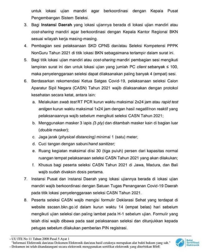 Surat tersebut juga memuat ketentuan protokol kesehatan pencegahan Covid-19 yang wajib dipatuhi oleh peserta ujian SKD CPNS dan Seleksi Kompetensi PPPK Non Guru tahun 2021. Ketentuan protokol kesehatan tersebut, antara lain: