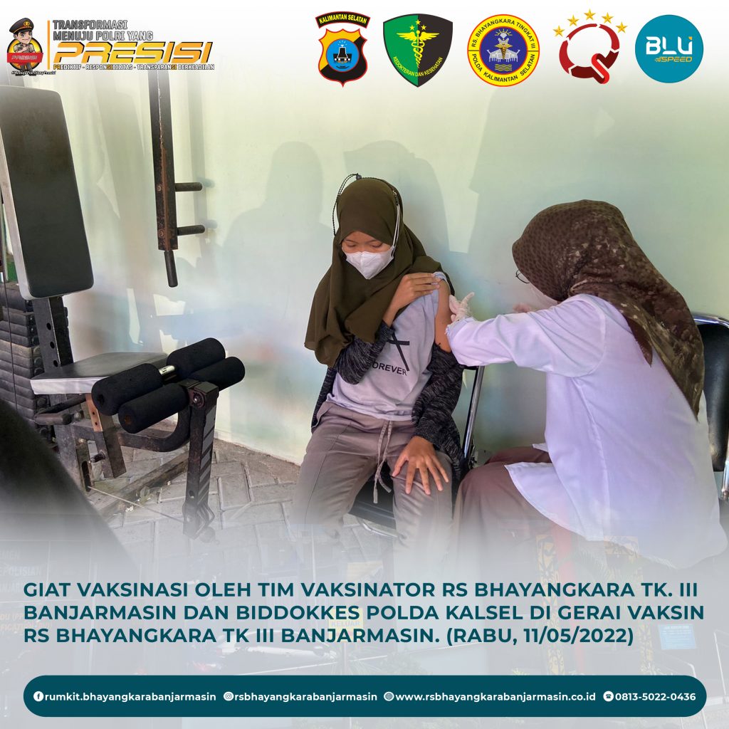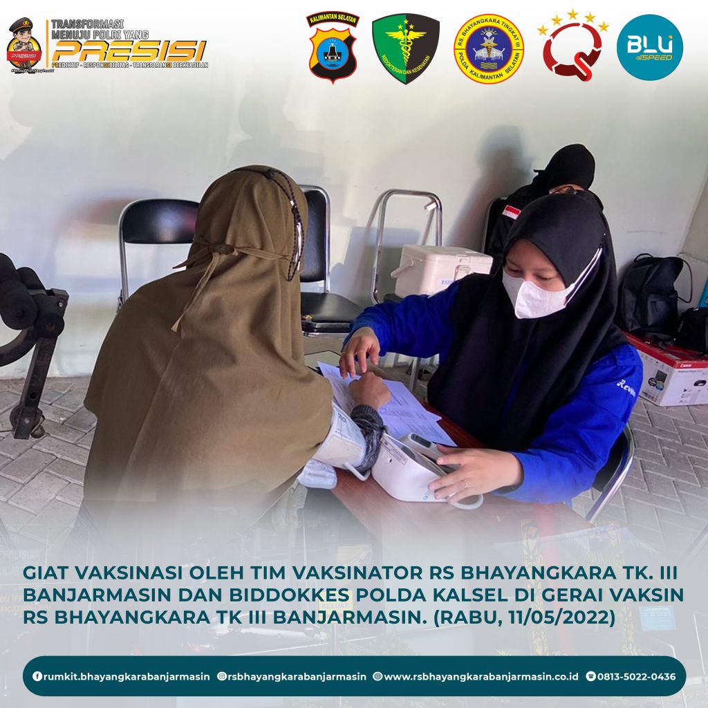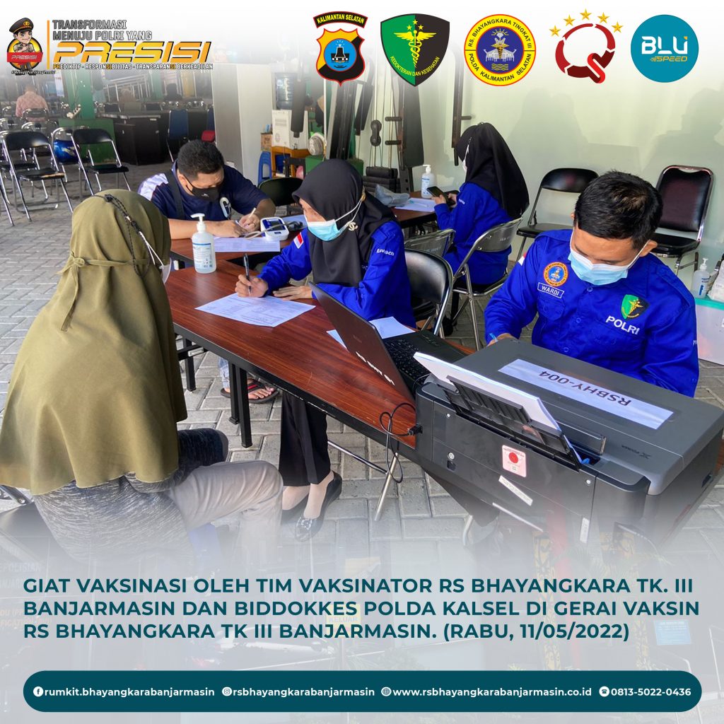 Giat Vaksinasi – Giat vaksinasi oleh tim Vaksinator RS Bhayangkara Tk III Hoegeng Iman Santoso Banjarmasin dan Biddokkes Polda Kalimantan Selatan di gerai vaksin Rumah Sakit Bhayangkara Tk III Hoegeng Iman Santoso Banjarmasin per tanggal 11 Mei 2022.