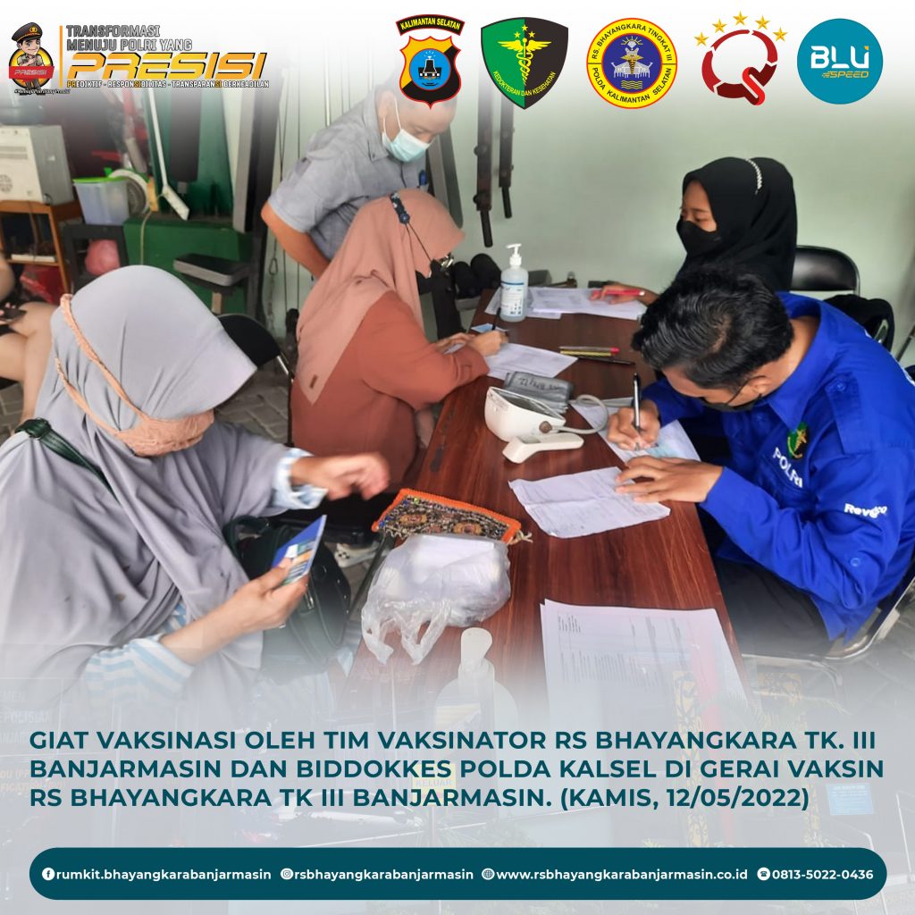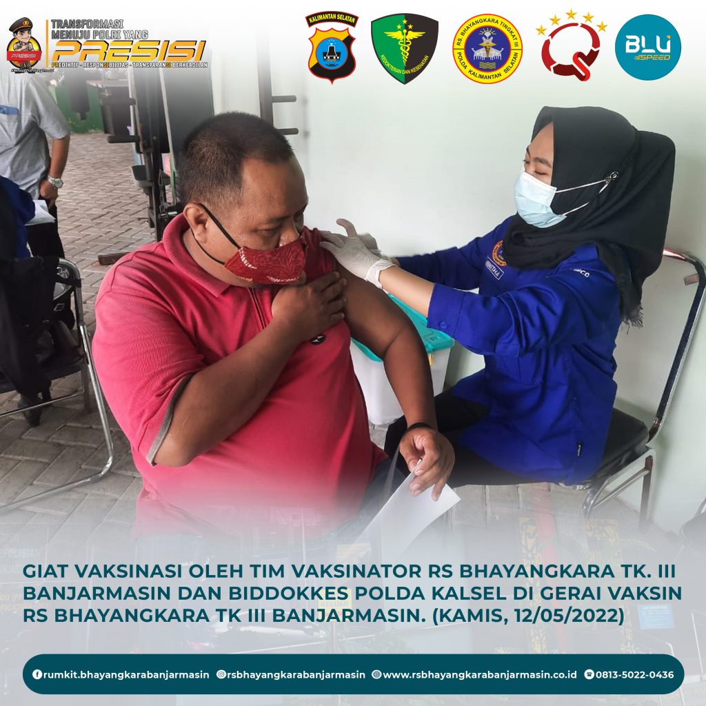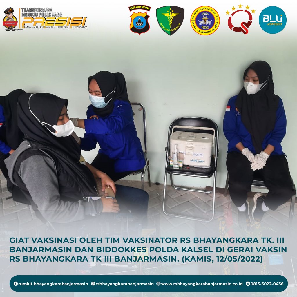 Giat Vaksinasi – Giat vaksinasi tim vaksinator RS Bhayangkara Banjarmasin dan Biddokkes Polda Kalimantan Selatan, Kamis 12 Mei 2022.
