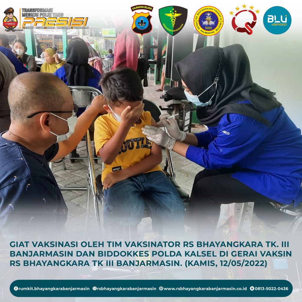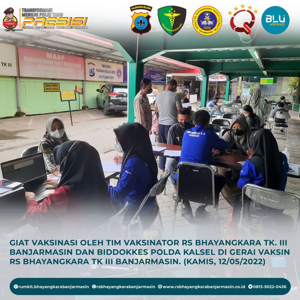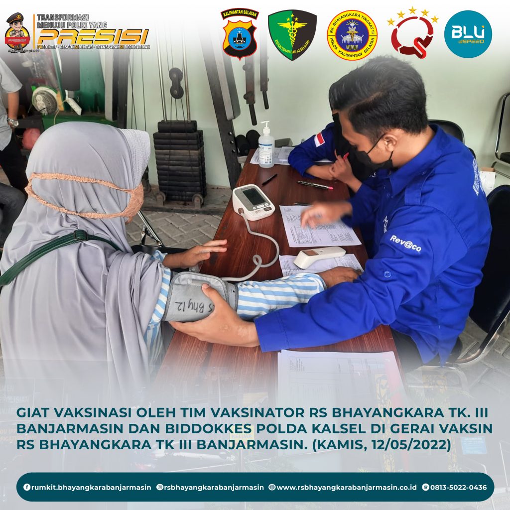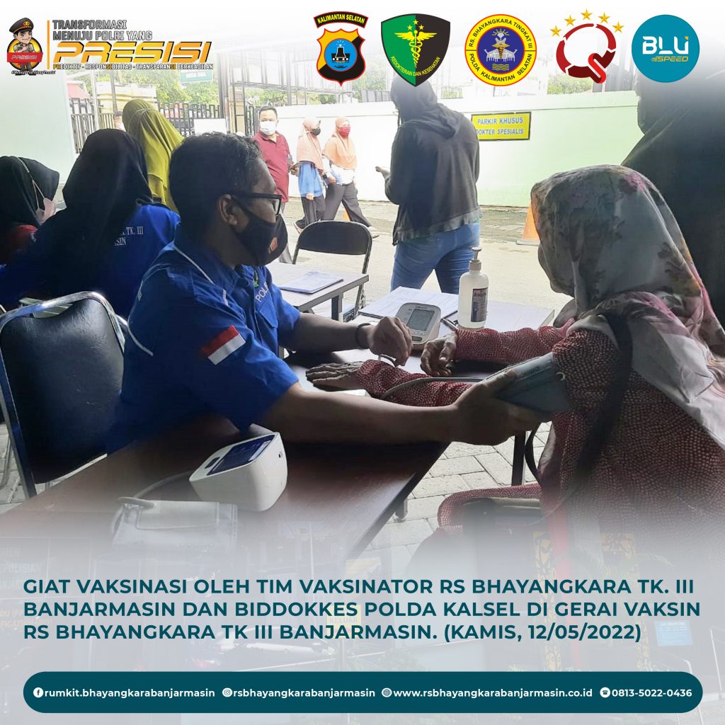 Giat Vaksinasi – Giat vaksinasi tim vaksinator RS Bhayangkara Banjarmasin dan Biddokkes Polda Kalimantan Selatan, Kamis 12 Mei 2022.