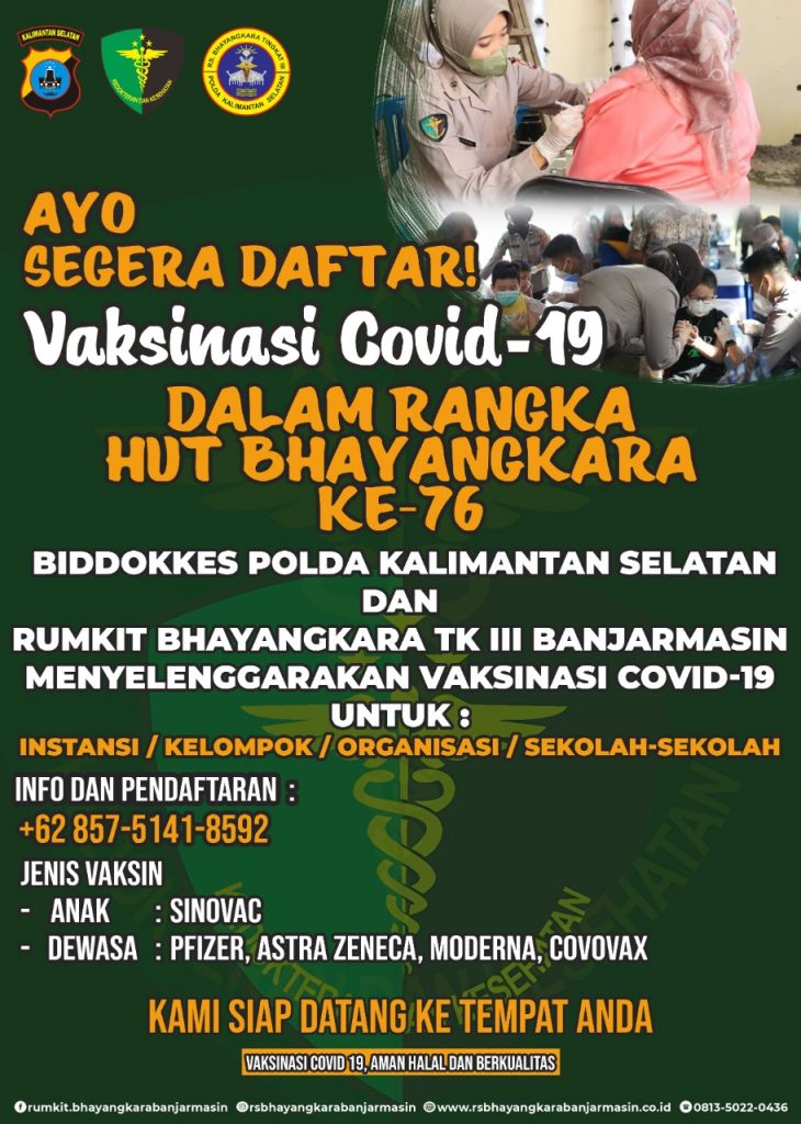 Vaksinasi Covid-19 – Ayo segera daftar Dalam rangka HUT Bhayangkara Ke-76 Biddokkes Polda Kalimantan Selatan dan Rumkit Bhayangkara Tk III Banjarmasin menyelenggarakan Vaksinasi COVID-19.