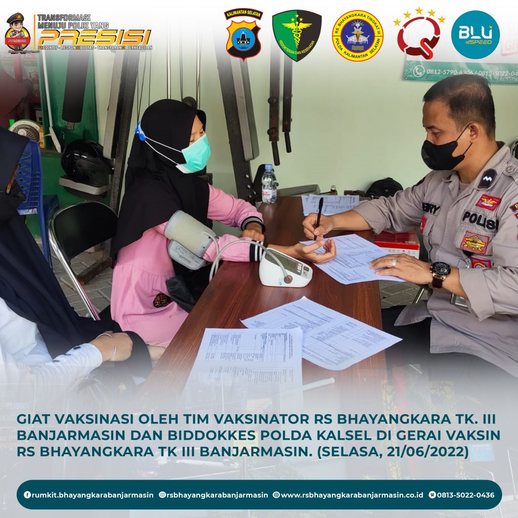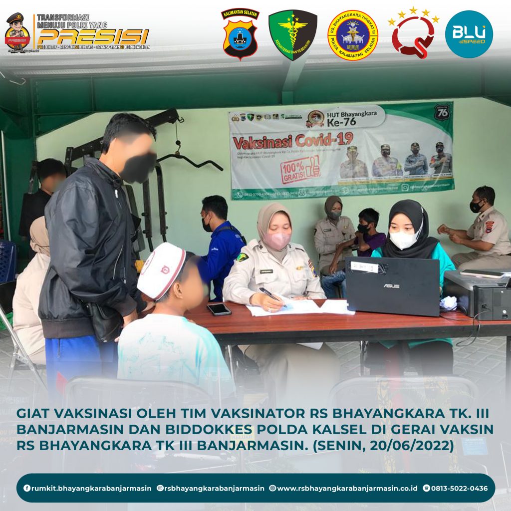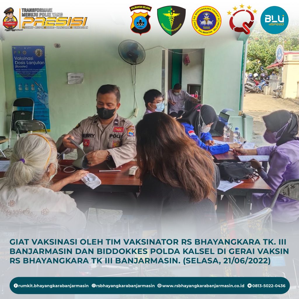Giat Vaksinasi – Giat vaksinasi tim vaksinator RS Bhayangkara Banjarmasin dan Biddokkes Polda Kalimantan Selatan, Selasa 21 Juni 2022.