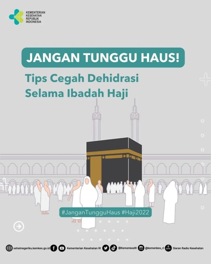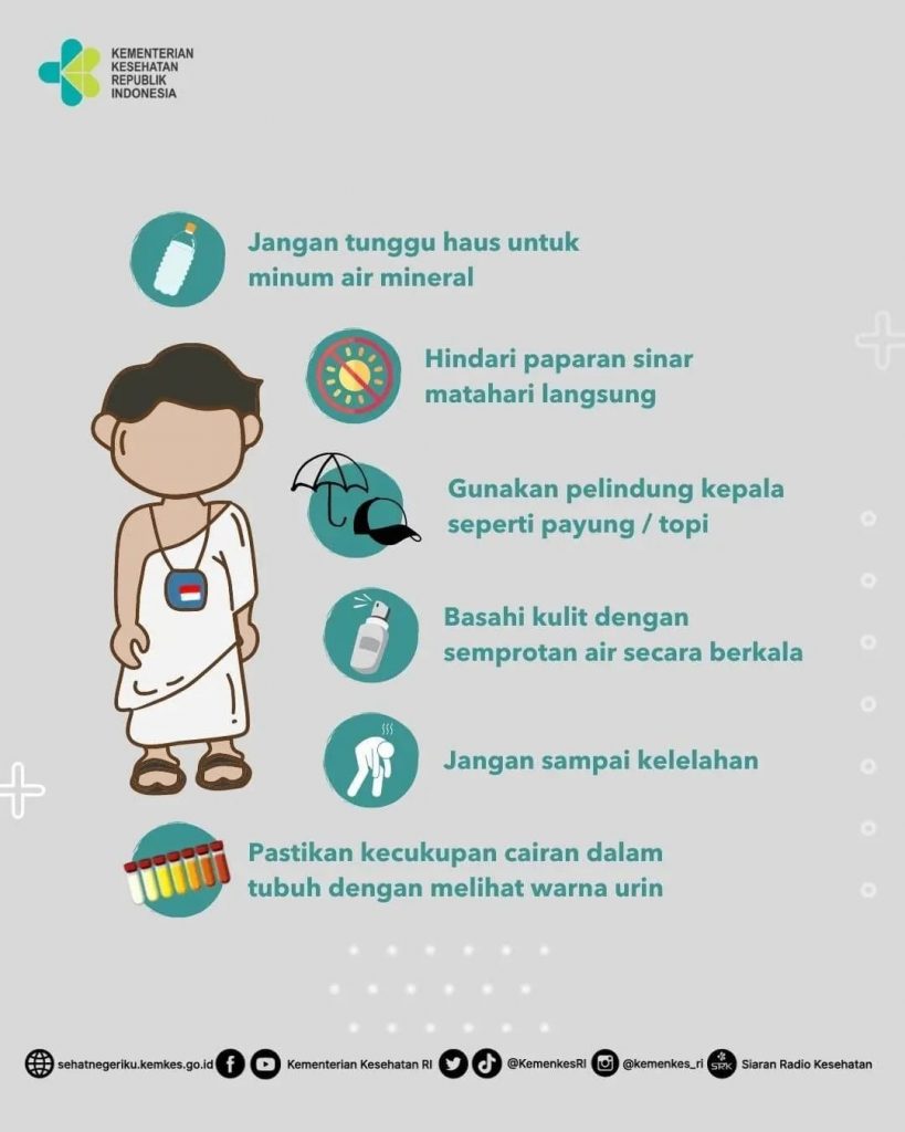Dehidrasi Selama Ibadah Haji – Pada puncak haji tahun ini suhu di Arab Saudi diperkirakan mencapai 50 derajat Celcius. Suhu panas berpotensi menyebabkan dehidrasi yang bisa mengganggu jalannya ibadah. Berikut adalah Tips Cegah Dehidrasi oleh Kemenkes.