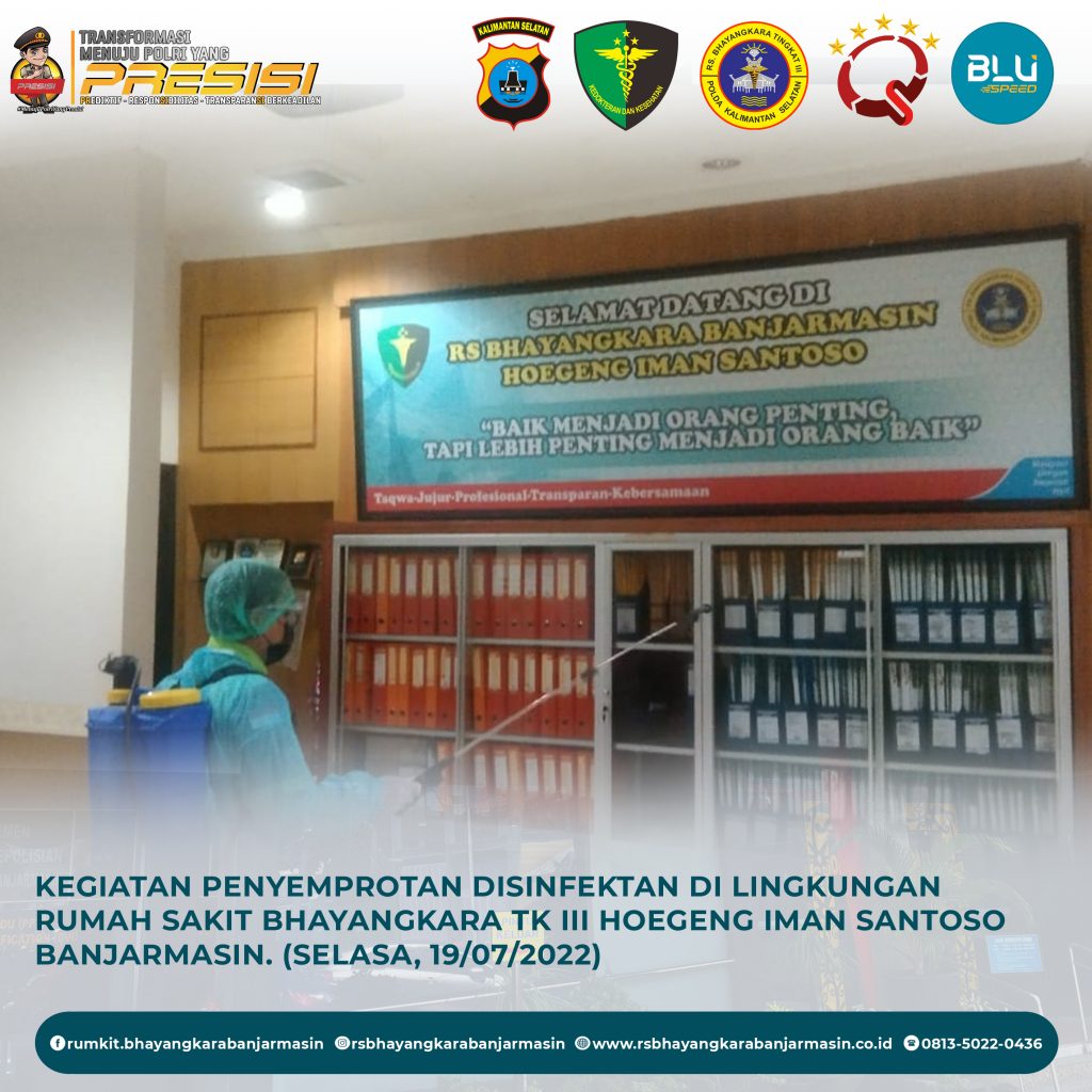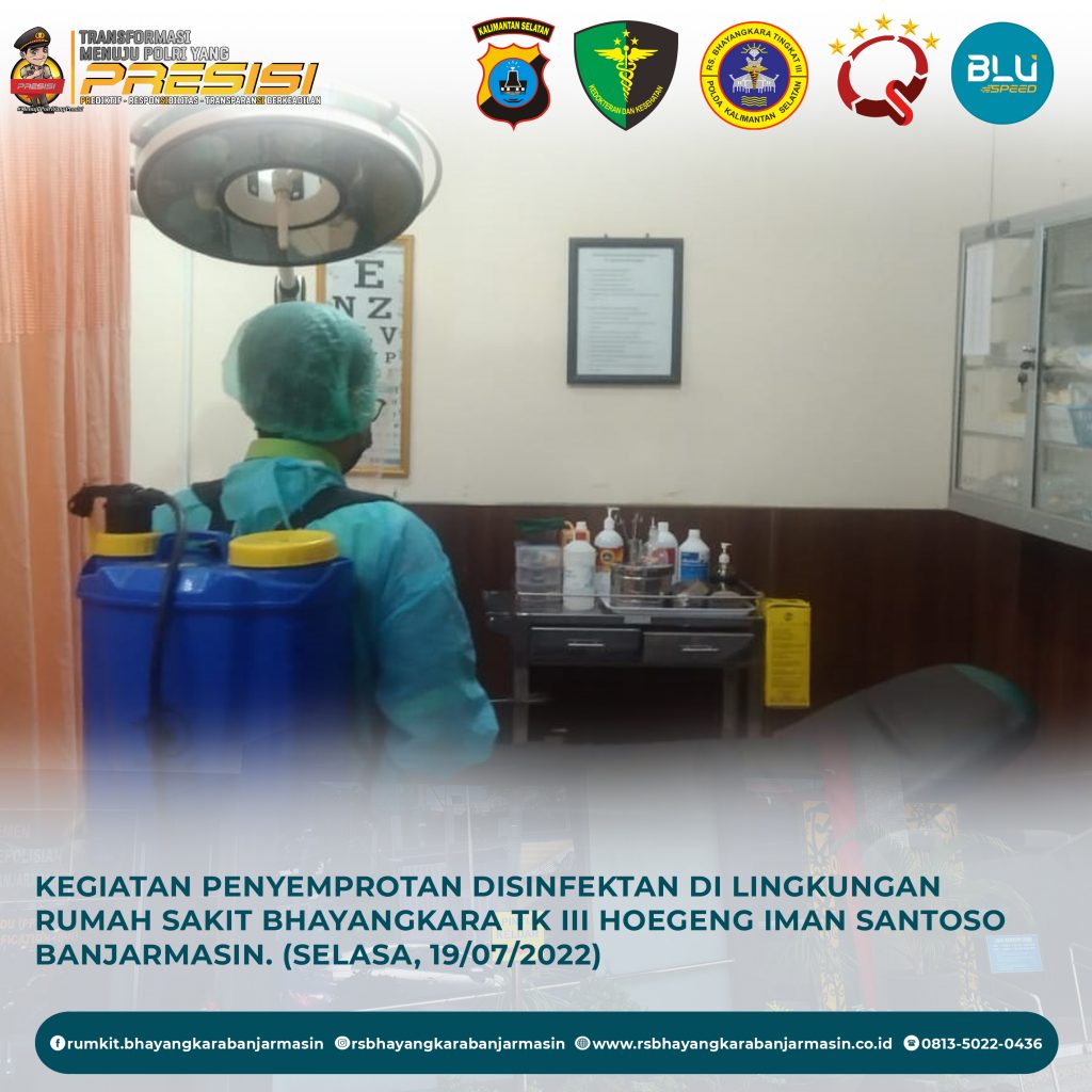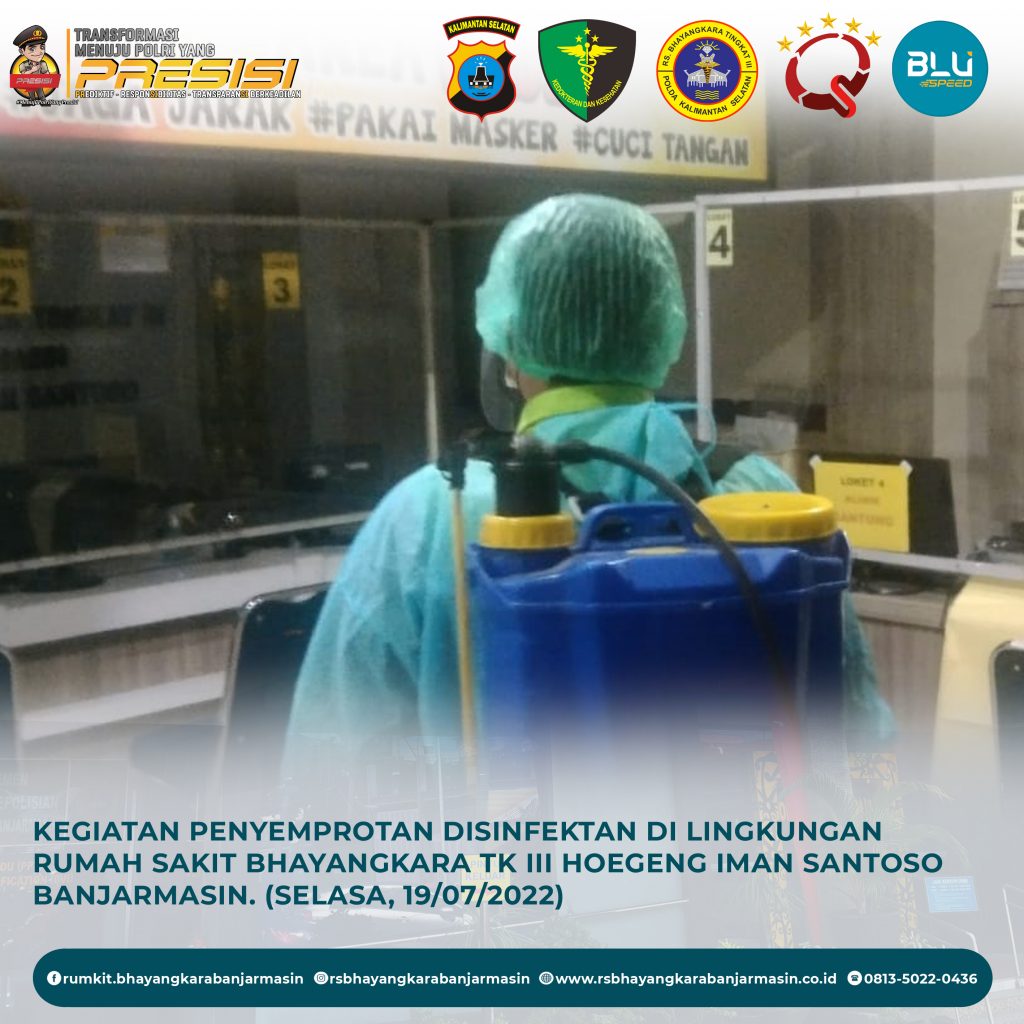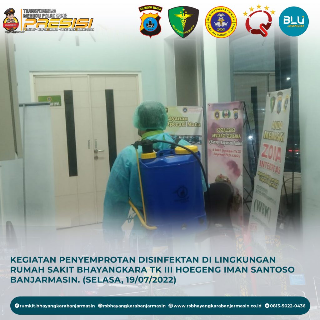 Disinfektanisasi – Kegiatan Disinfektanisasi di Lingkungan Rumah Sakit Bhayangkara Tk III Hoegeng Iman Santoso Banjarmasin agar penyebaran virus Covid-19 terputus.