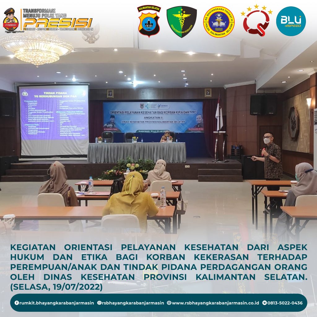 Orientasi Pelayanan Kesehatan – Kegiatan Orientasi Pelayanan Kesehatan dari Aspek Hukum dan Etika bagi Korban Kekerasan terhadap Perempuan/Anak dan Tindak Pidana Perdagangan Orang yang diselenggarakan oleh Dinas Kesehatan Provinsi Kalimantan Selatan dengan Narasumber dr. Agus Susilo Susanto Kauryanmed Subbidyanmeddokpol Rumkit Bhayangkara Tk III Banjarmasin.