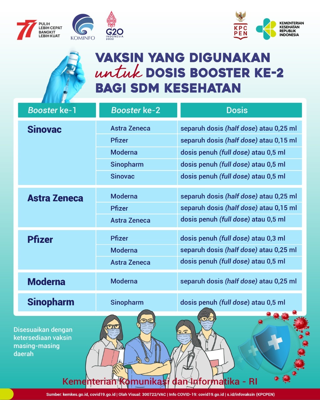 Vaksin Booster ke 2 – Pemerintah mendorong vaksinasi booster tahap kedua Untuk para SDM Kesehatan. Dosis dan jenis vaksin yang diberikan disesuaikan dengan vaksin booster pertama dan disesuaikan dengan ketersediaan vaksin masing-masing daerah.