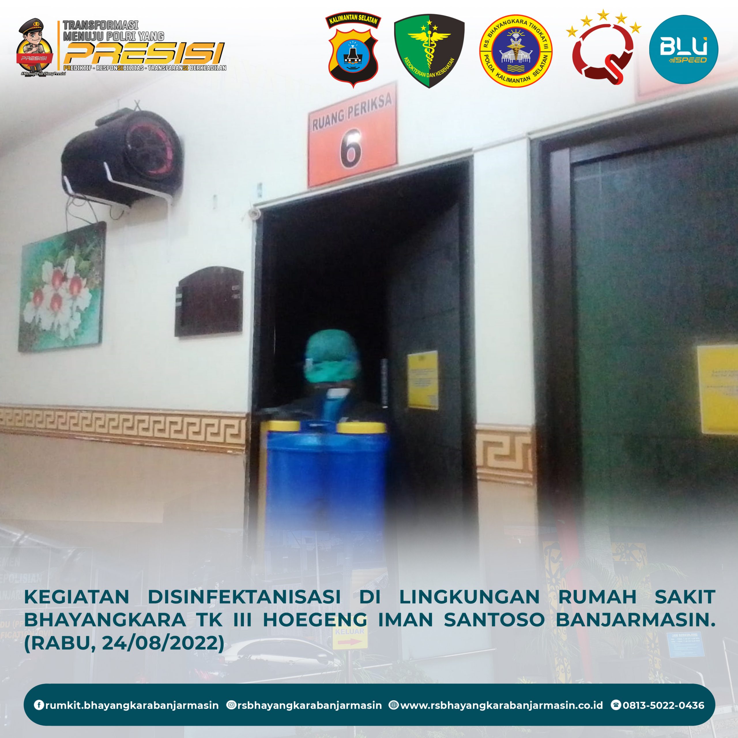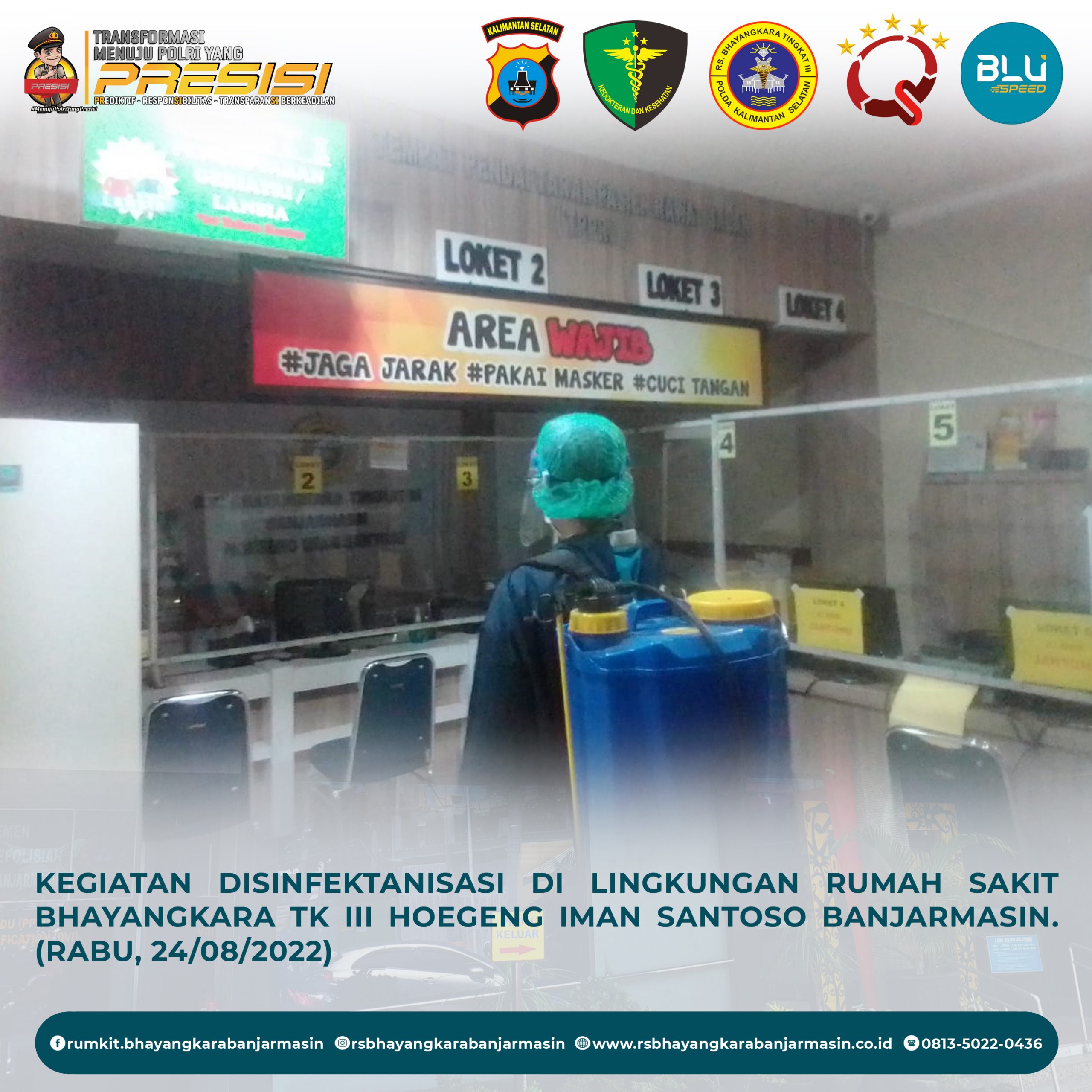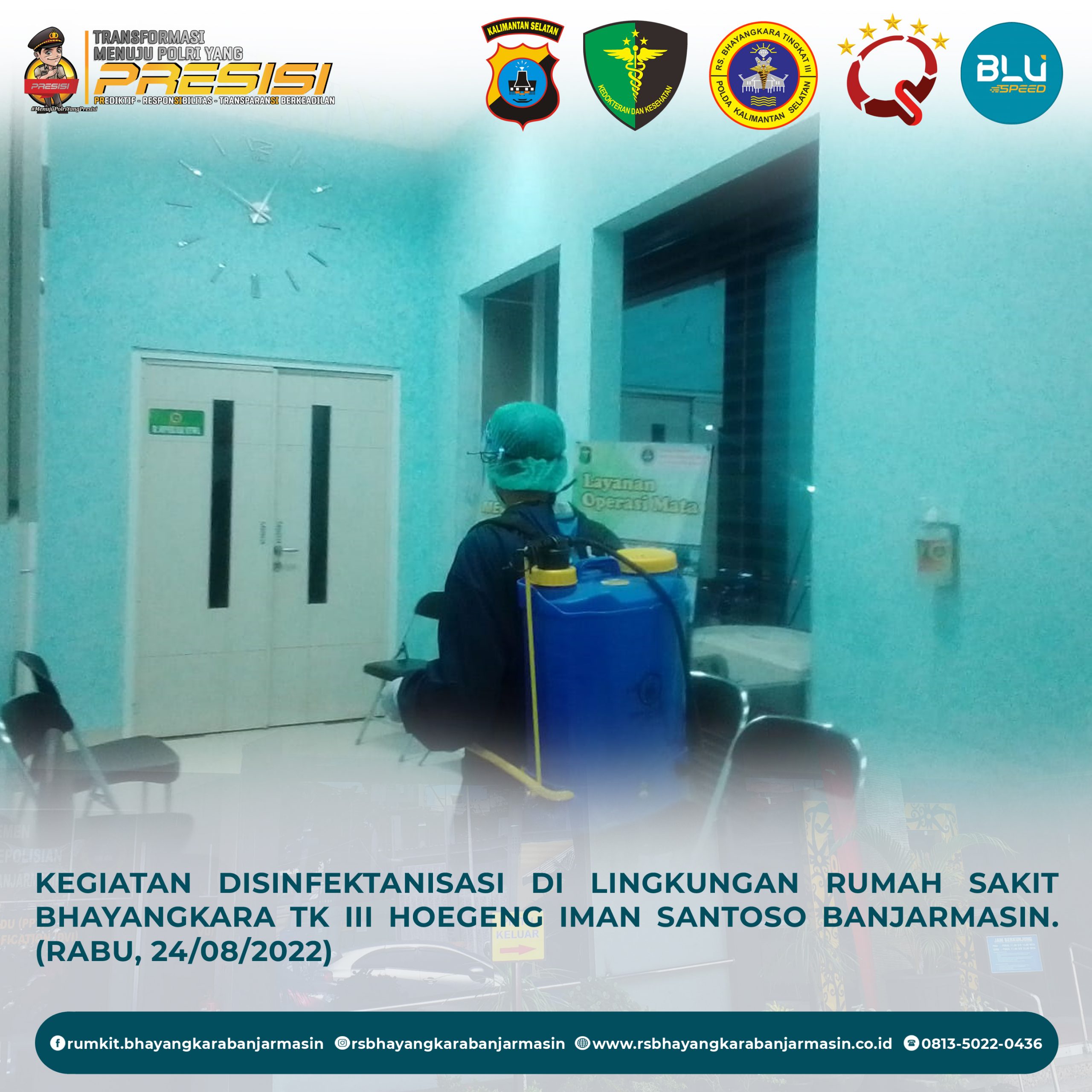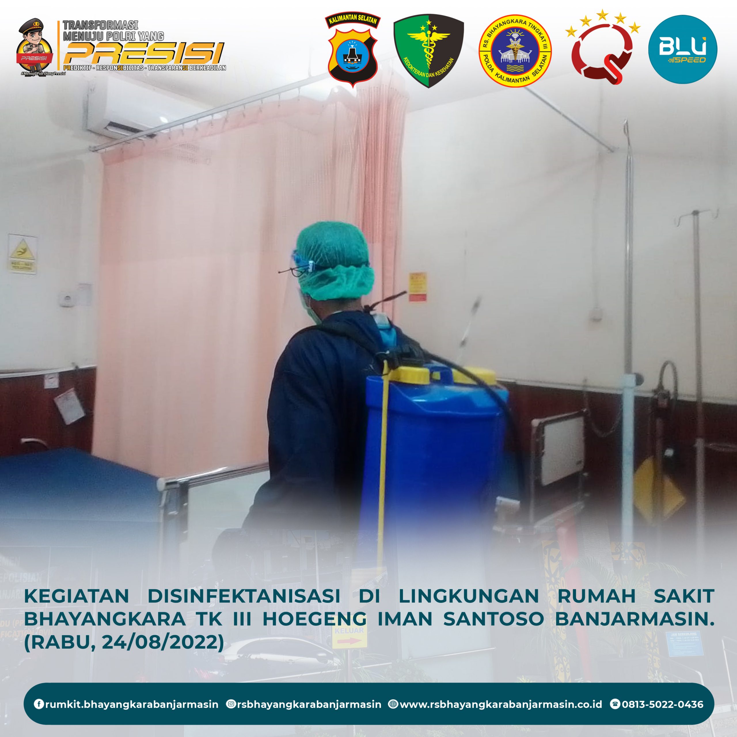 Disinfektanisasi – Kegiatan Disinfektanisasi untuk Mencegah Penyebaran Covid-19 di Lingkungan Rumah Sakit Bhayangkara Tk III Hoegeng Iman Santoso Banjarmasin.