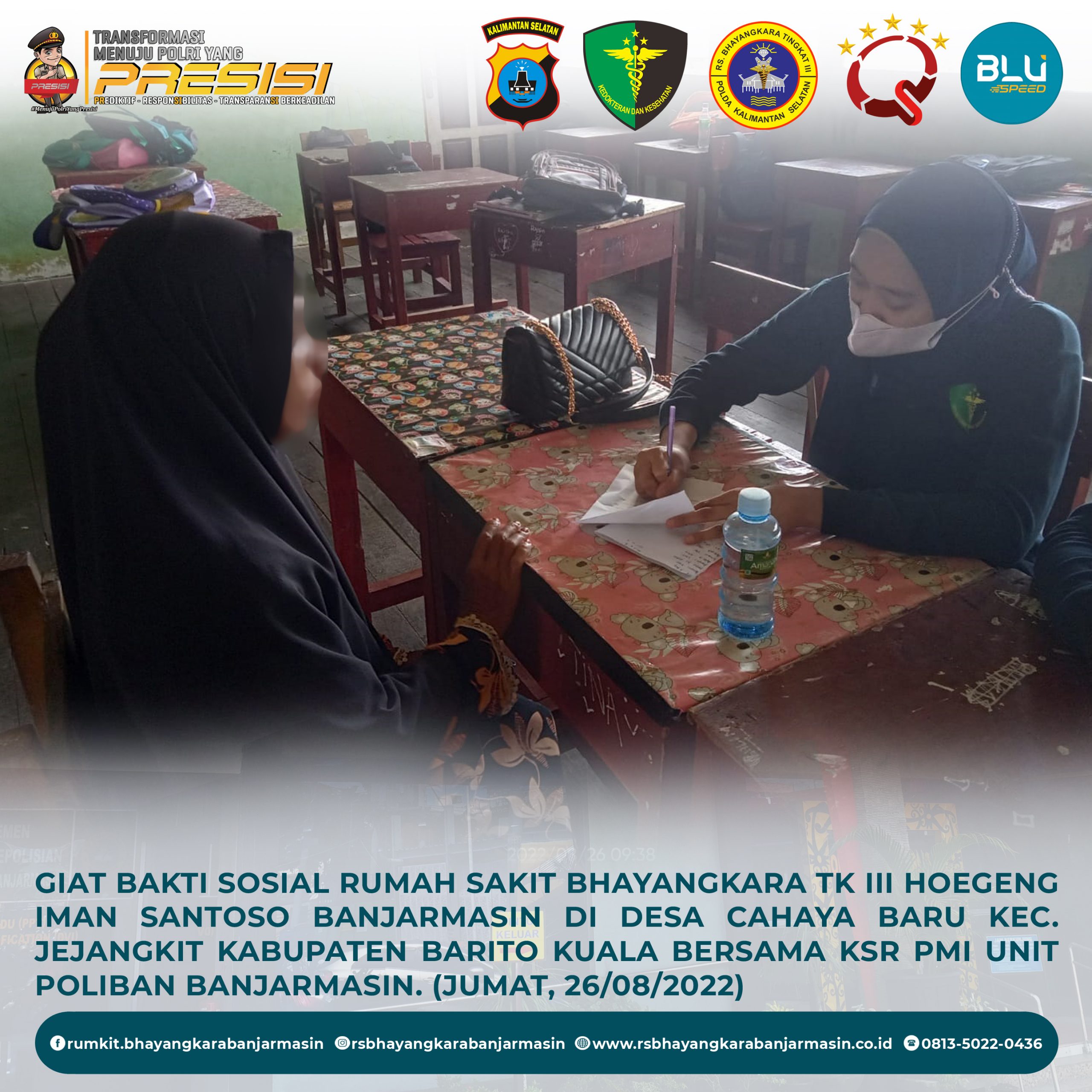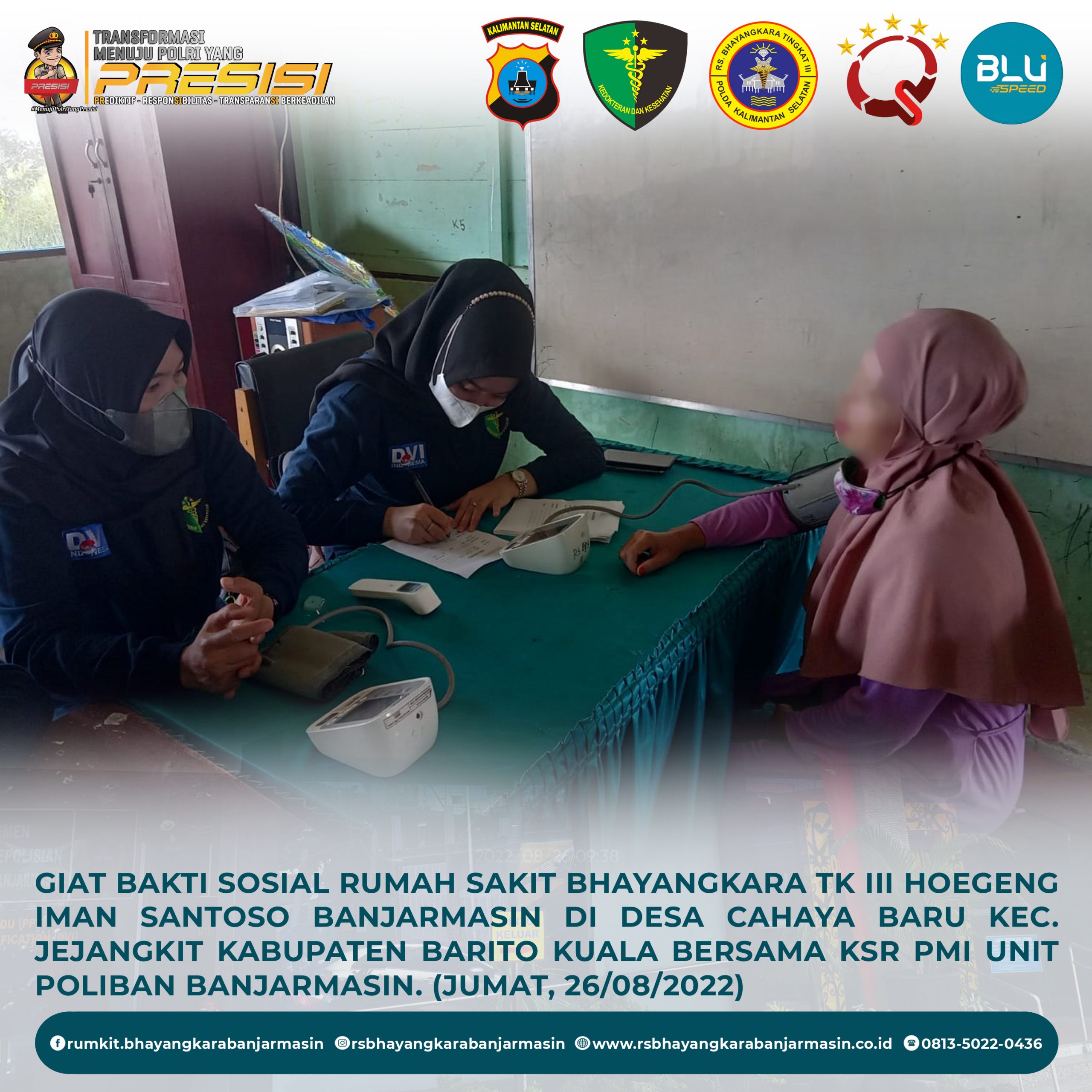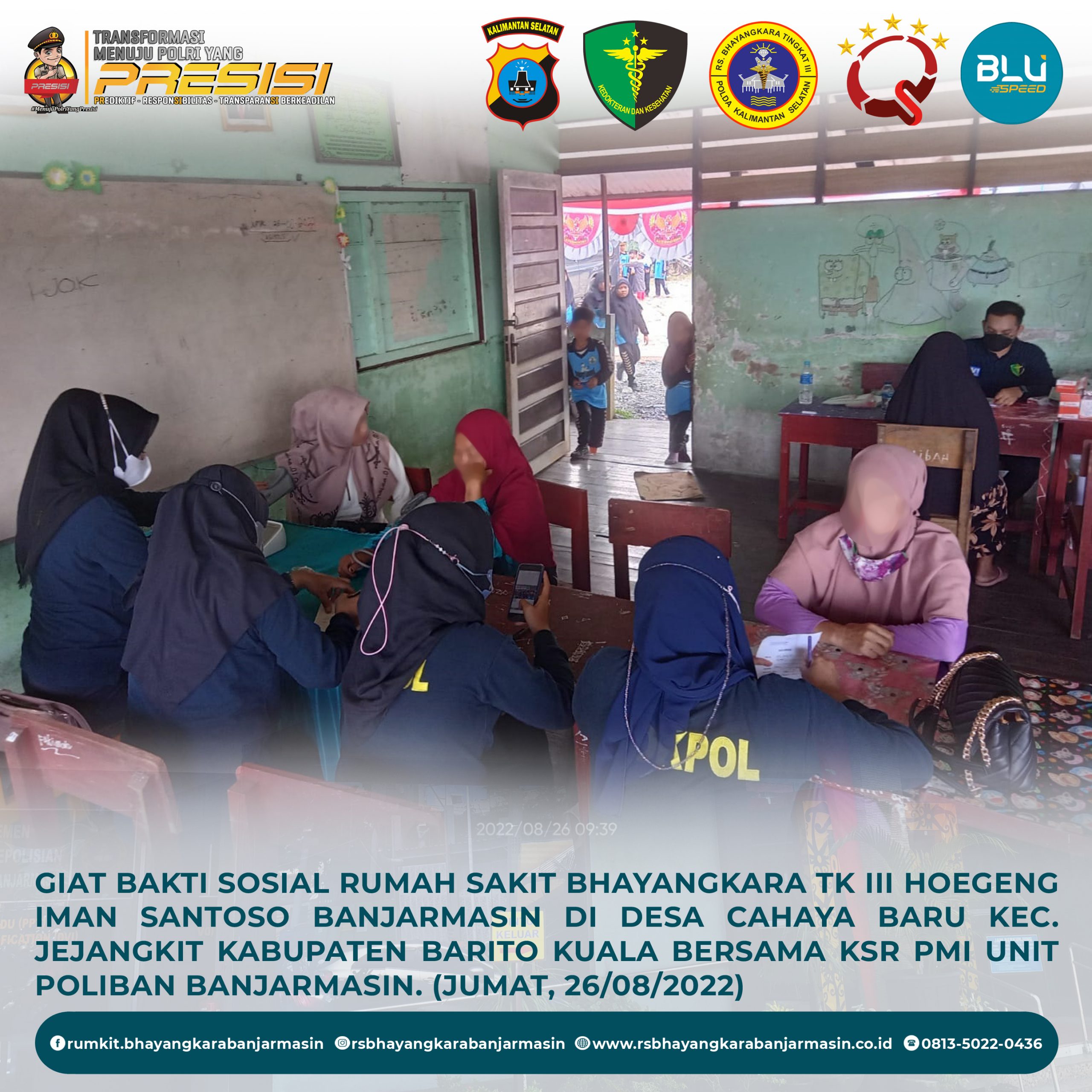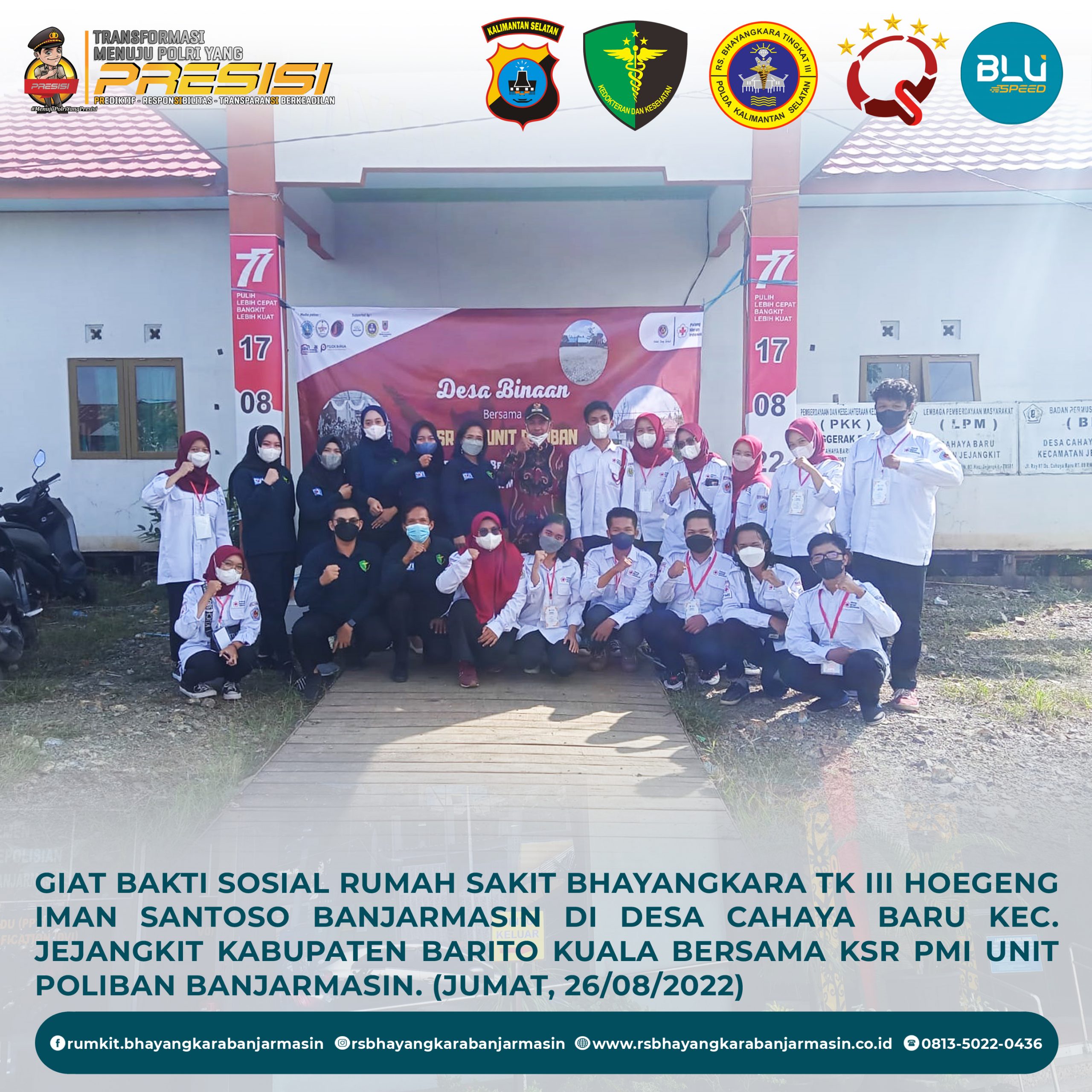 Giat Bakti Sosial – Giat Bakti Sosial Rumah sakit Bhayangkara Tk III Hoegeng Iman Santoso Banjarmasin di Desa Cahaya Baru Kecamatan jejangkit Kabupaten Barito Kuala bersama KSR PMI unit Poliban Banjarmasin.