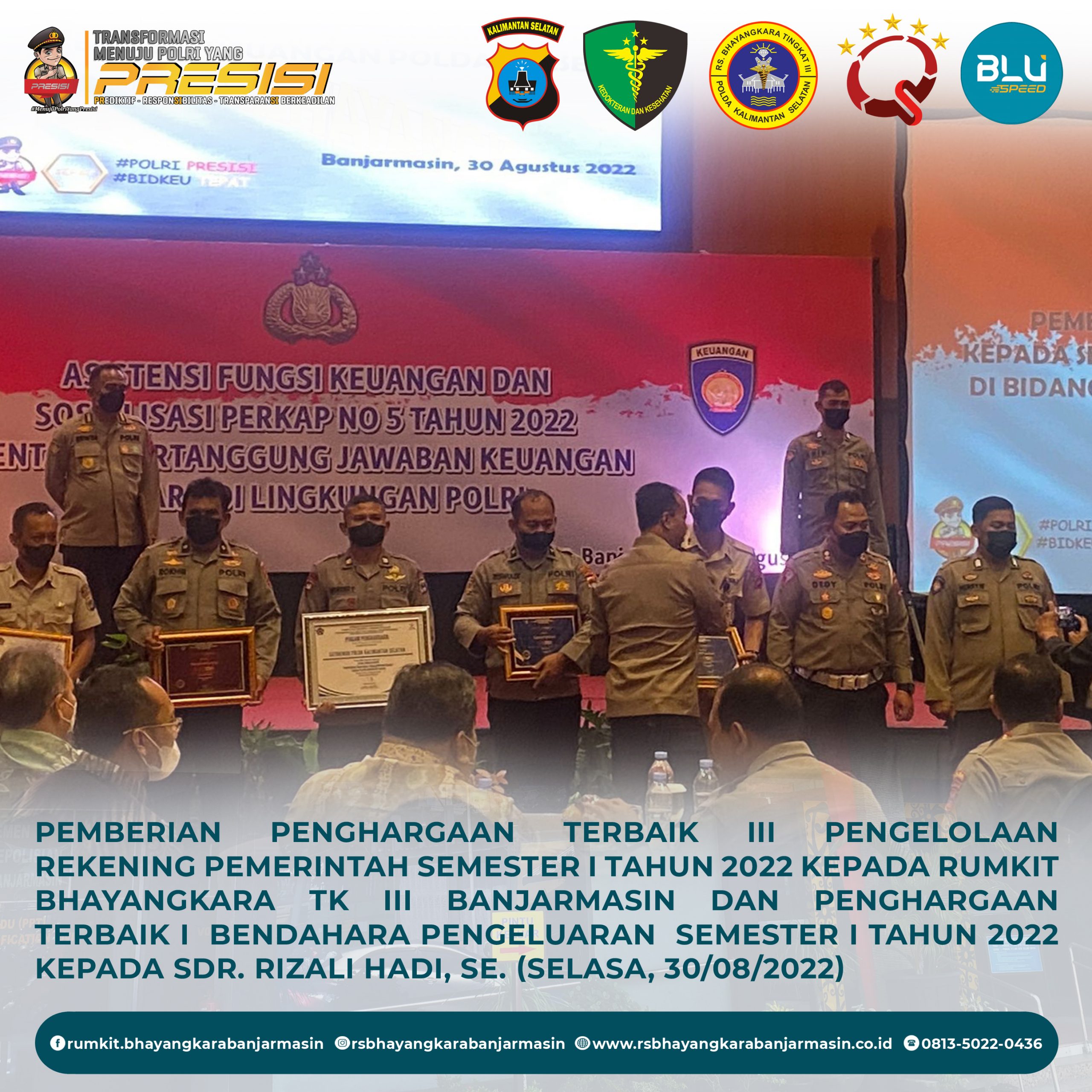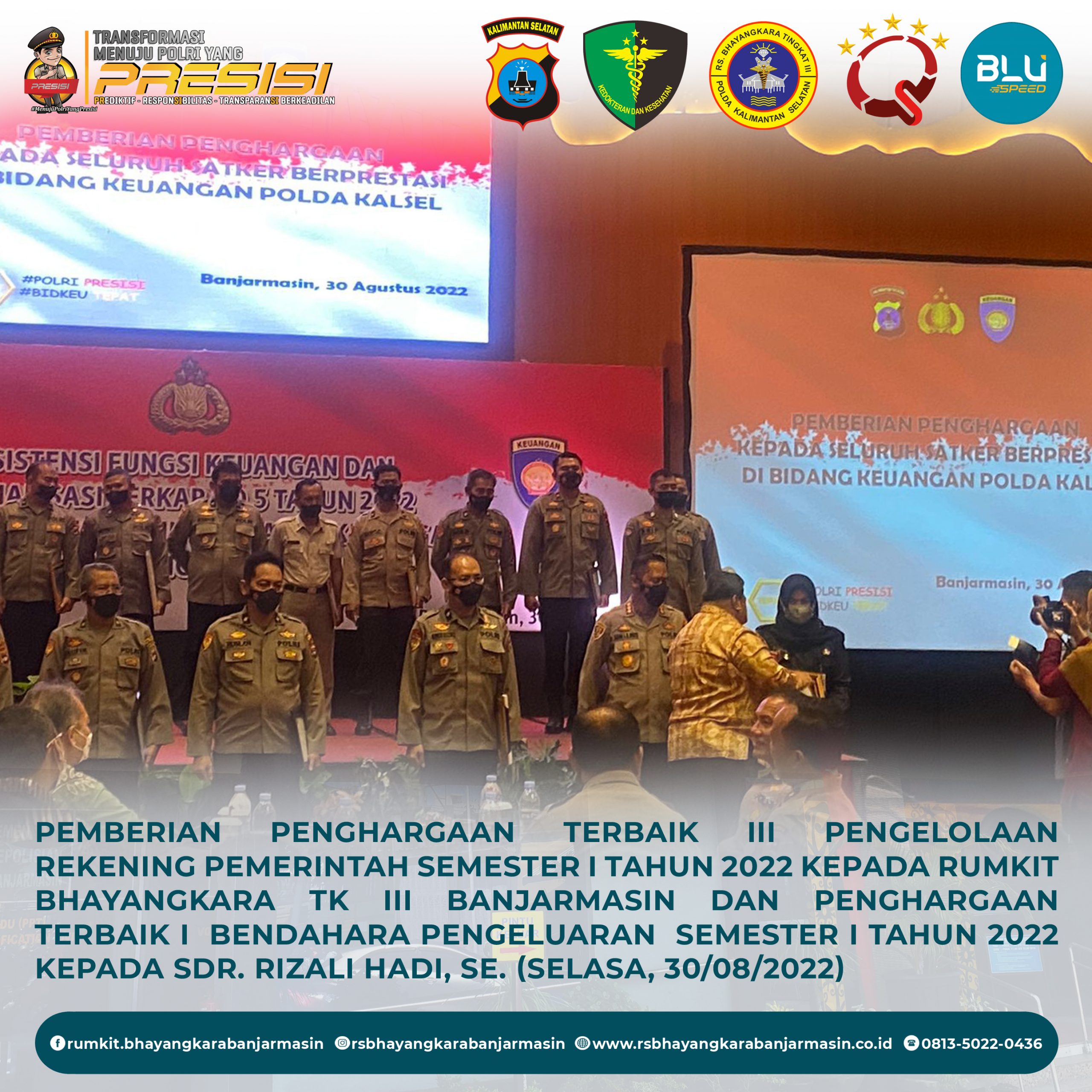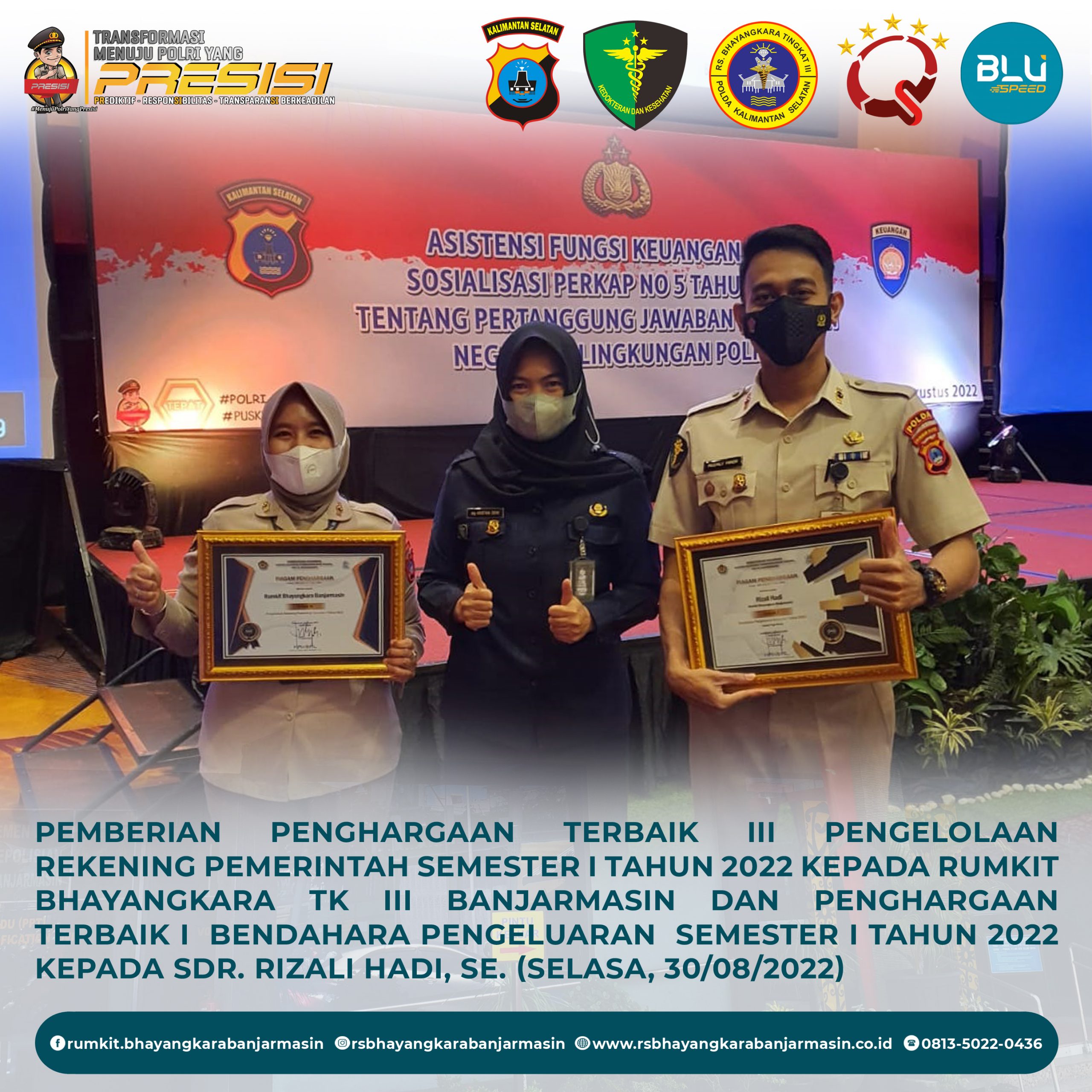 Banjarmasin – Penerimaan penghargaan terbaik III pengelolaan rekening pemerintah semester I tahun 2022 kepada Rumkit Bhayangkara Tk III Banjarmasin dan penghargaan terbaik I bendahara pengeluaran semester I tahun 2022 kepada sdr. Rizali Hadi, SE