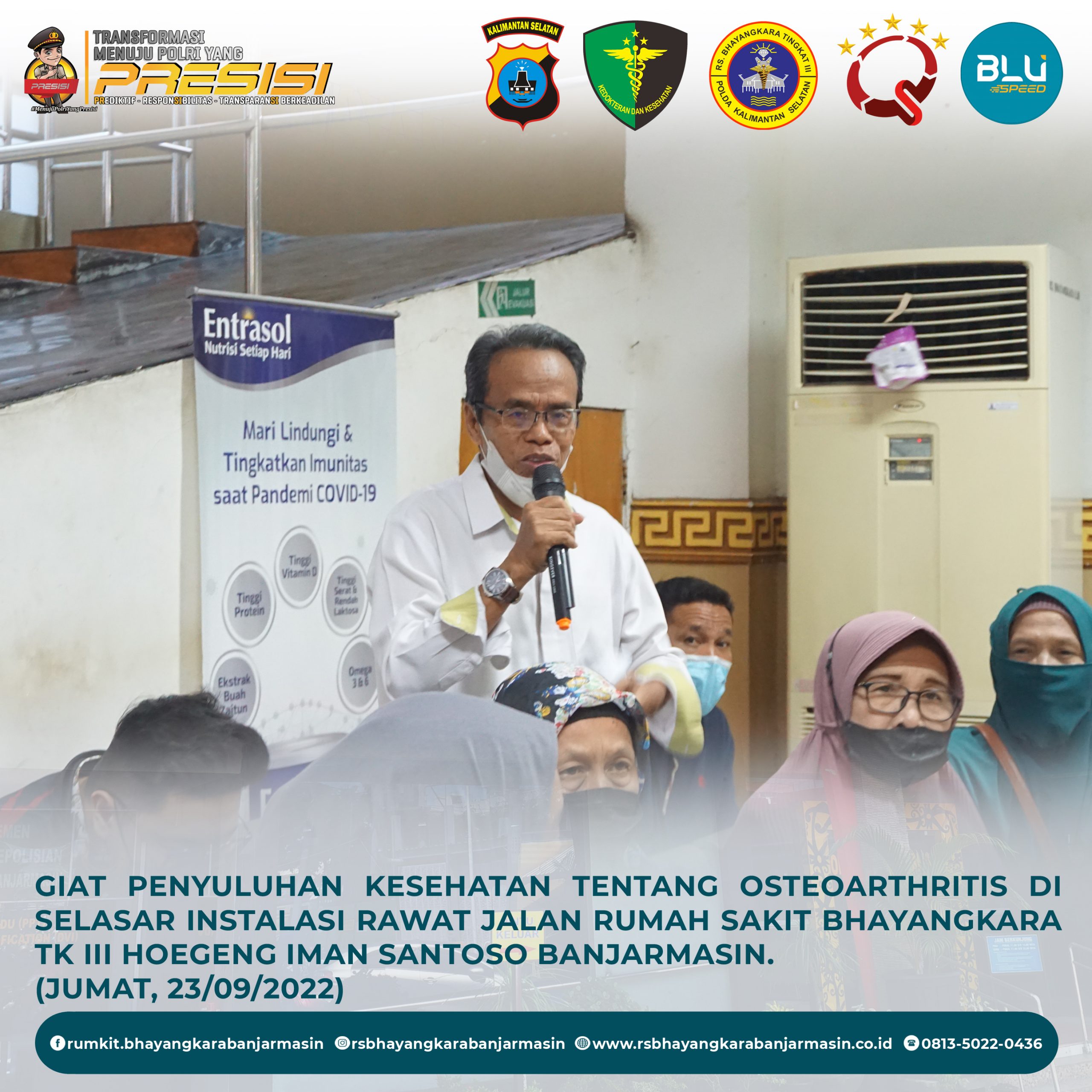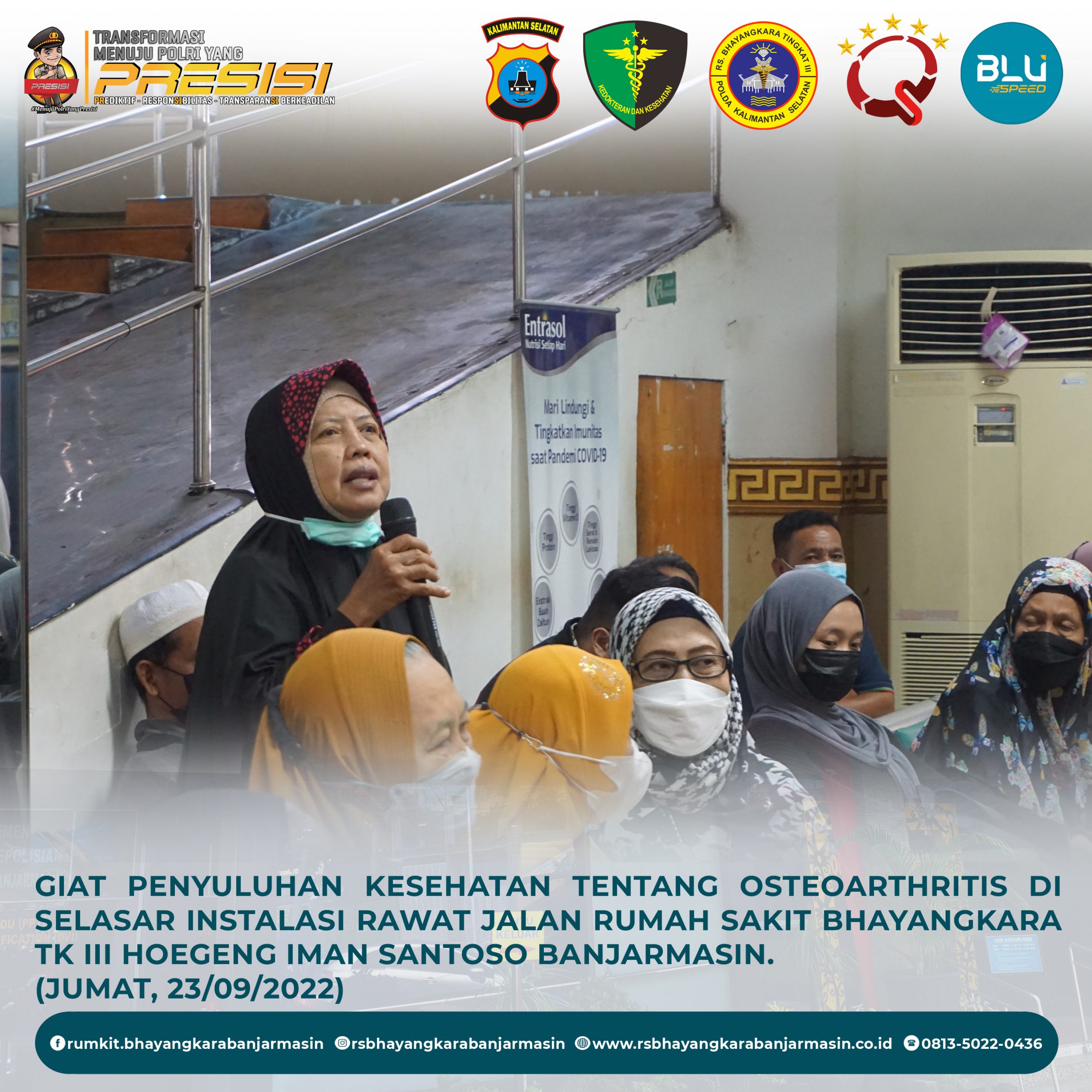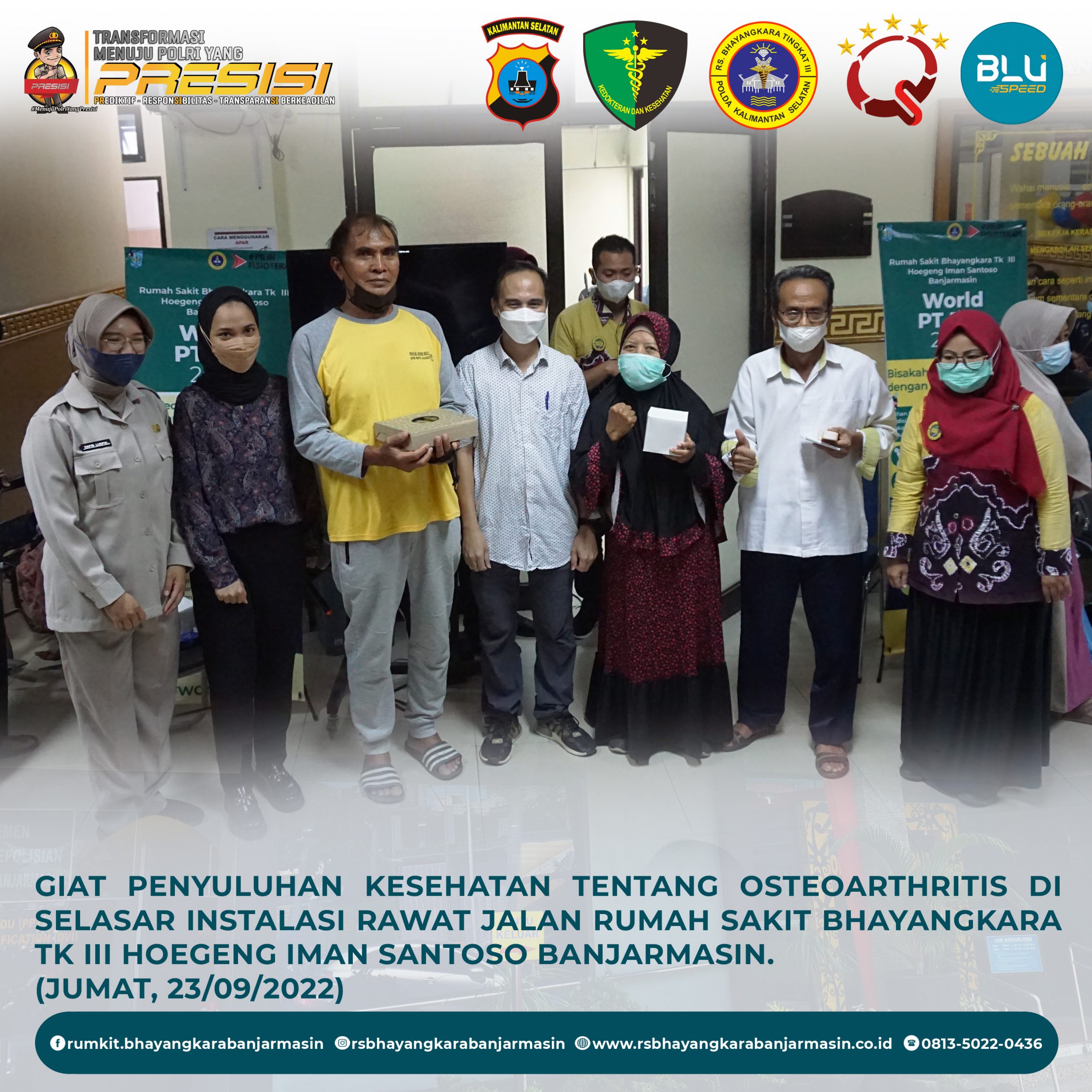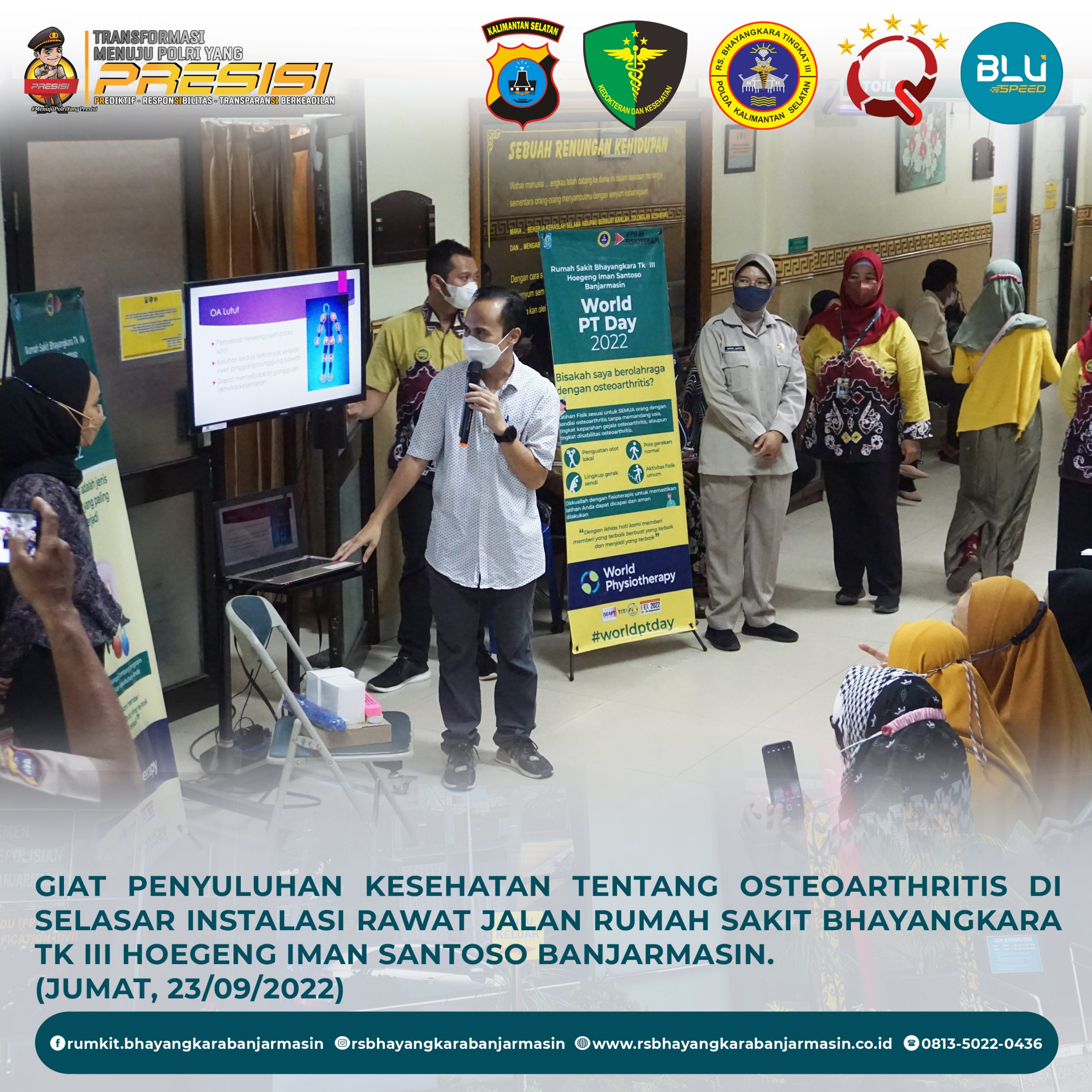 Osteoarthritis – Penyuluhan kesehatan tentang Osteoarthritis dalam rangka memperingati HUT Ikatan Fisioterapi Indonesia, oleh Tim Fisioterapi dan Tim Promosi Kesehatan Rumkit Bhayangkara Tk III Banjarmasi di selasar Instalasi Rawat Jalan dan sebagai pemberi materi / narasumber adalah dokter spesialis Kedokteran Fisik & Rehabilitasi dr. Muhammad Siddik, Sp.KFR.