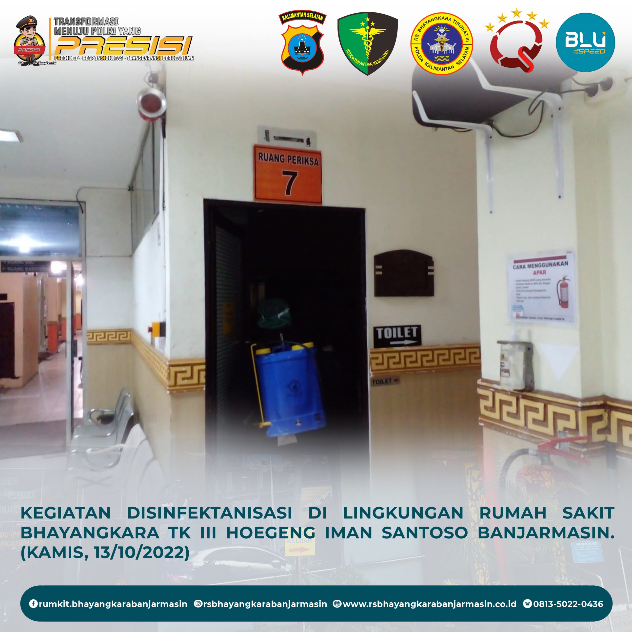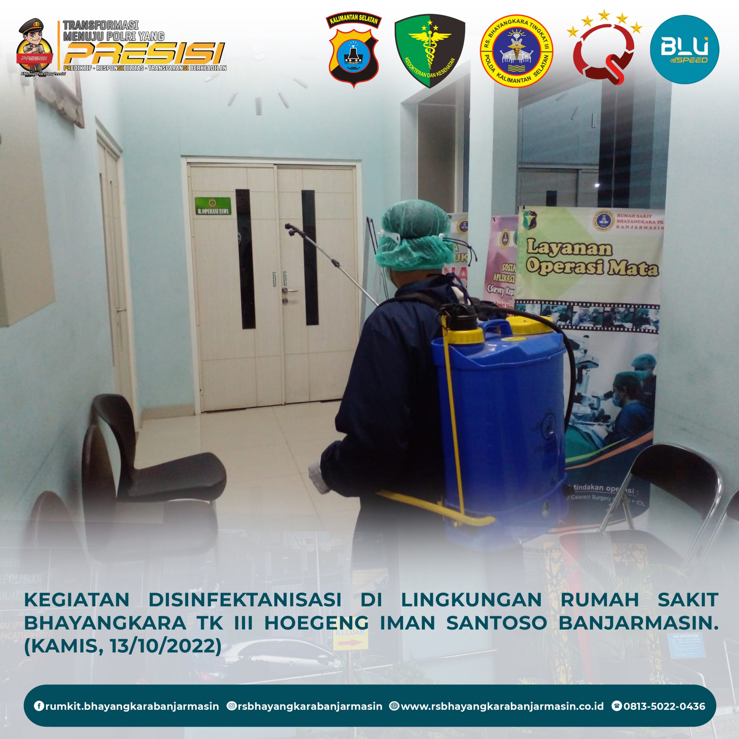 Disinfektanisasi – Kegiatan Disinfektanisasi untuk Mencegah Penyebaran Covid-19 di Lingkungan Rumah Sakit Bhayangkara Tk III Hoegeng Iman Santoso Banjarmasin.