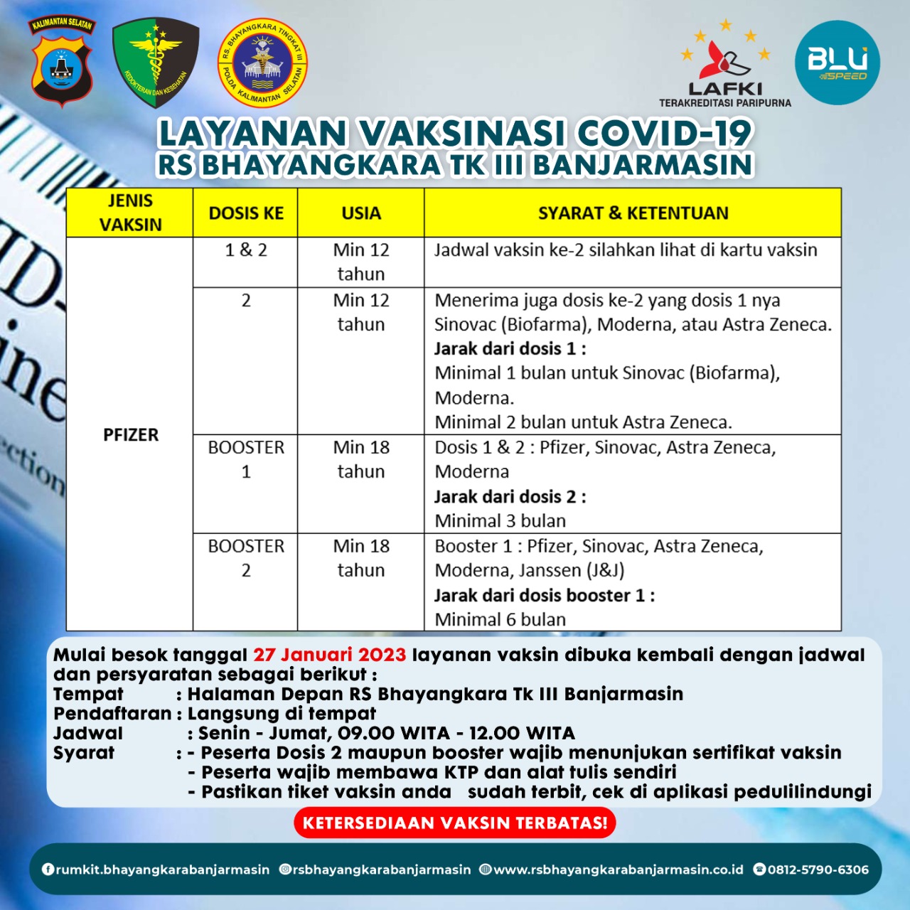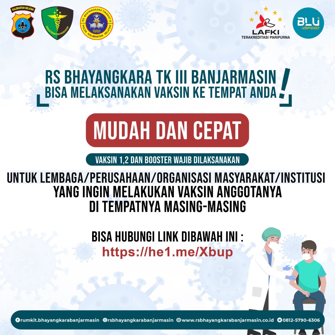 Pengumuman Giat Vaksinasi Covid-19 RS Bhayangkara Tk III Banjarmasin January 26, 2023 Admin ITBeritaKesehatan Vaksinasi Covid-19 – Pengumuman Jadwal Giat Vaksinasi Covid-19 Rumkit Bhayangkara Tk III Banjarmasin.