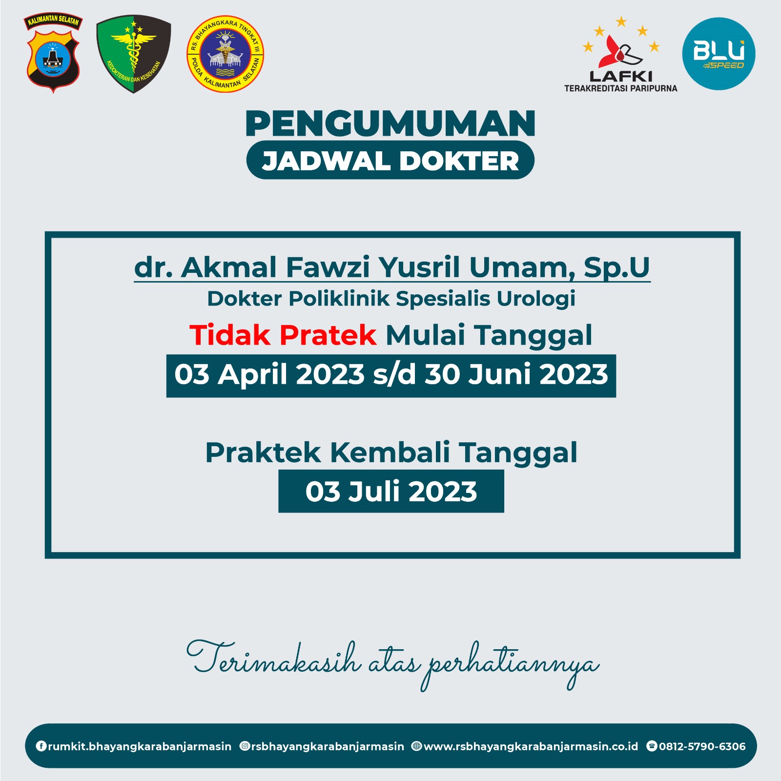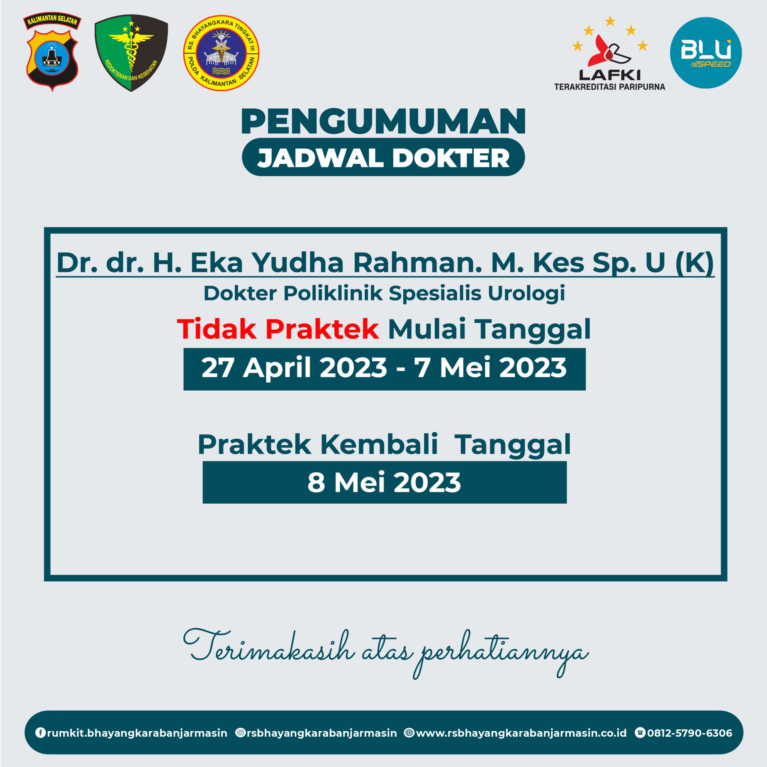 Spesialis Urologi – Pengumuman informasi Jadwal Dokter spesialis Urologi Rumkit Bhayangkara Tk III Banjarmasin.