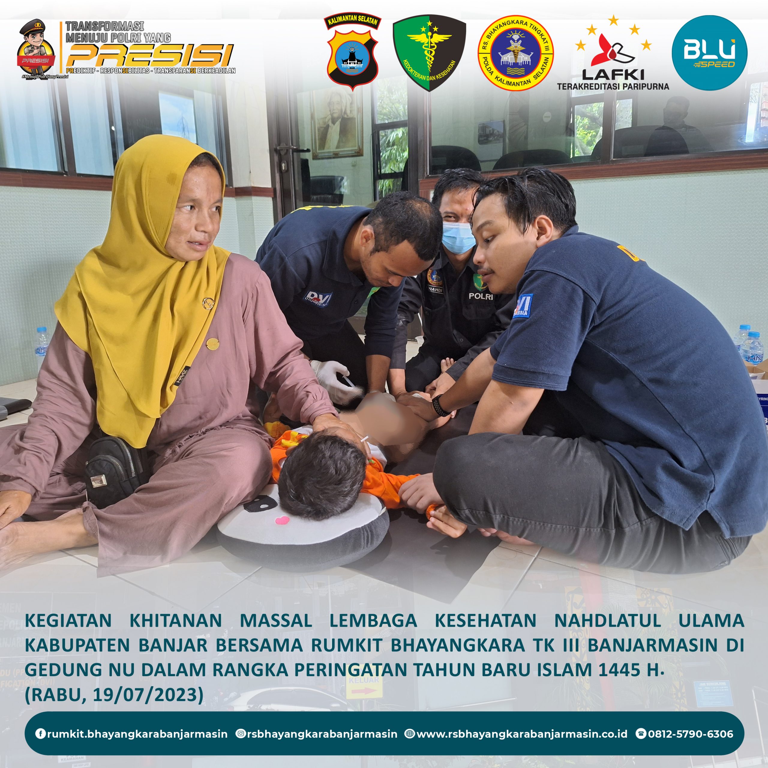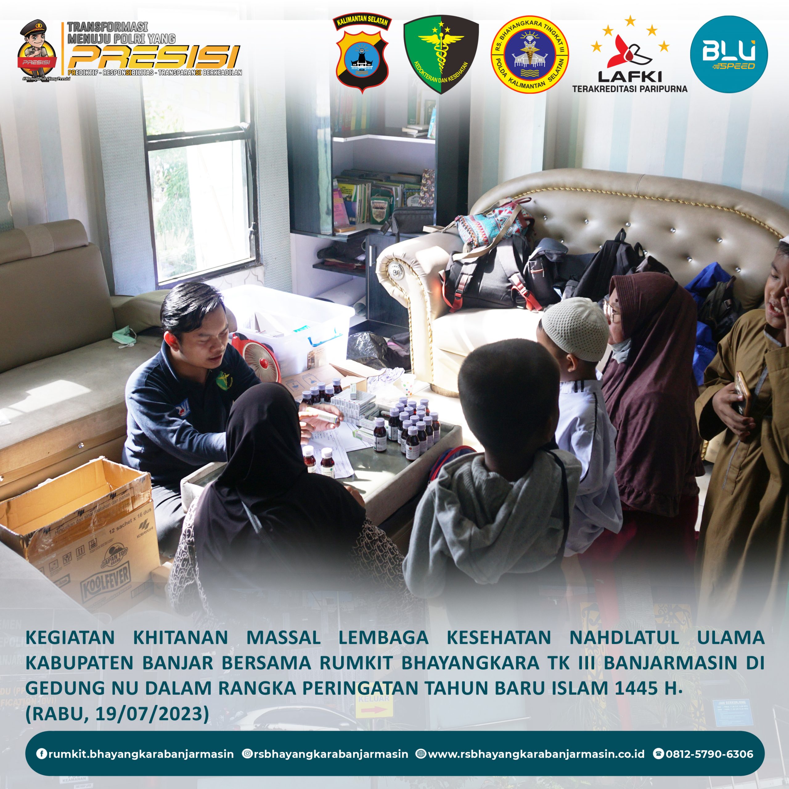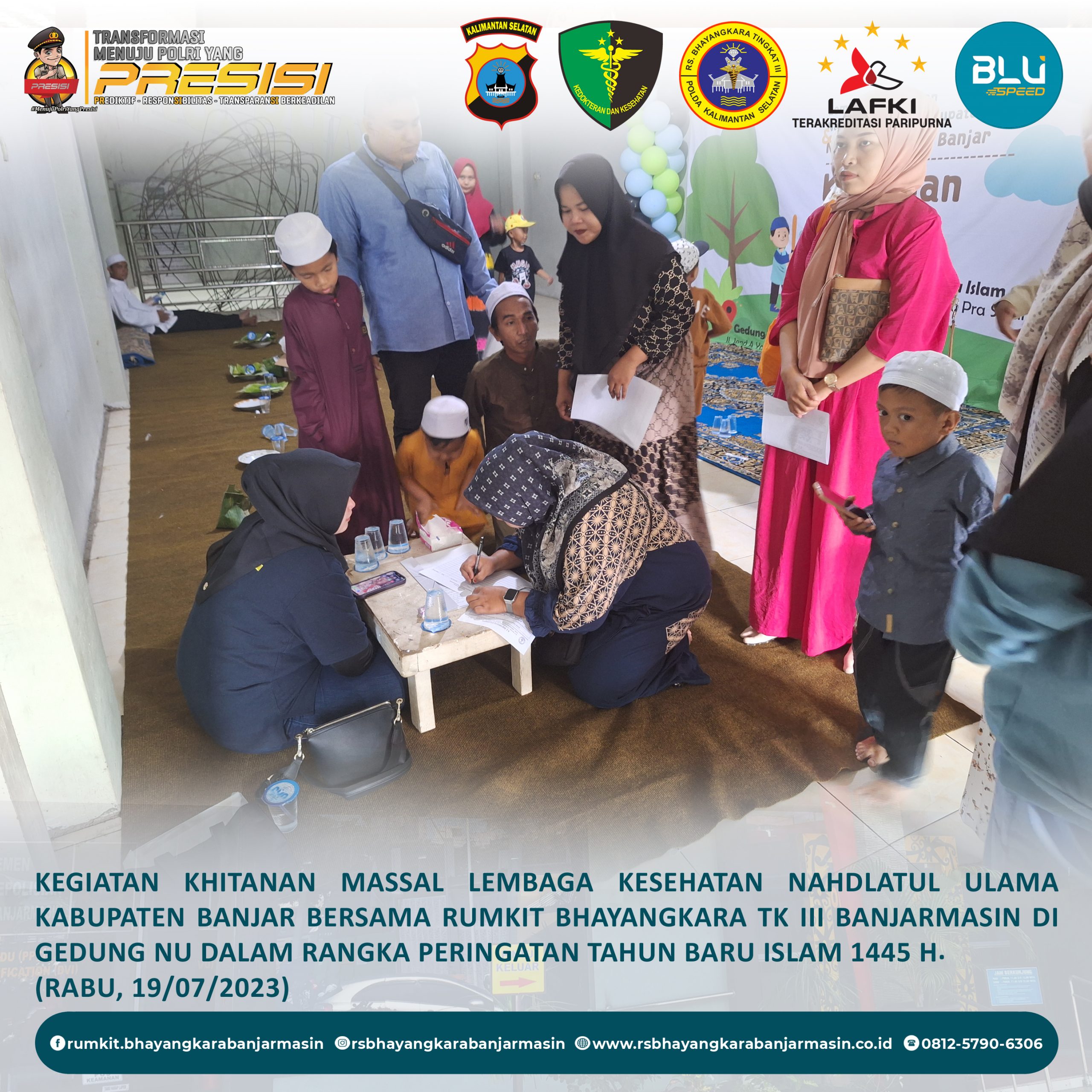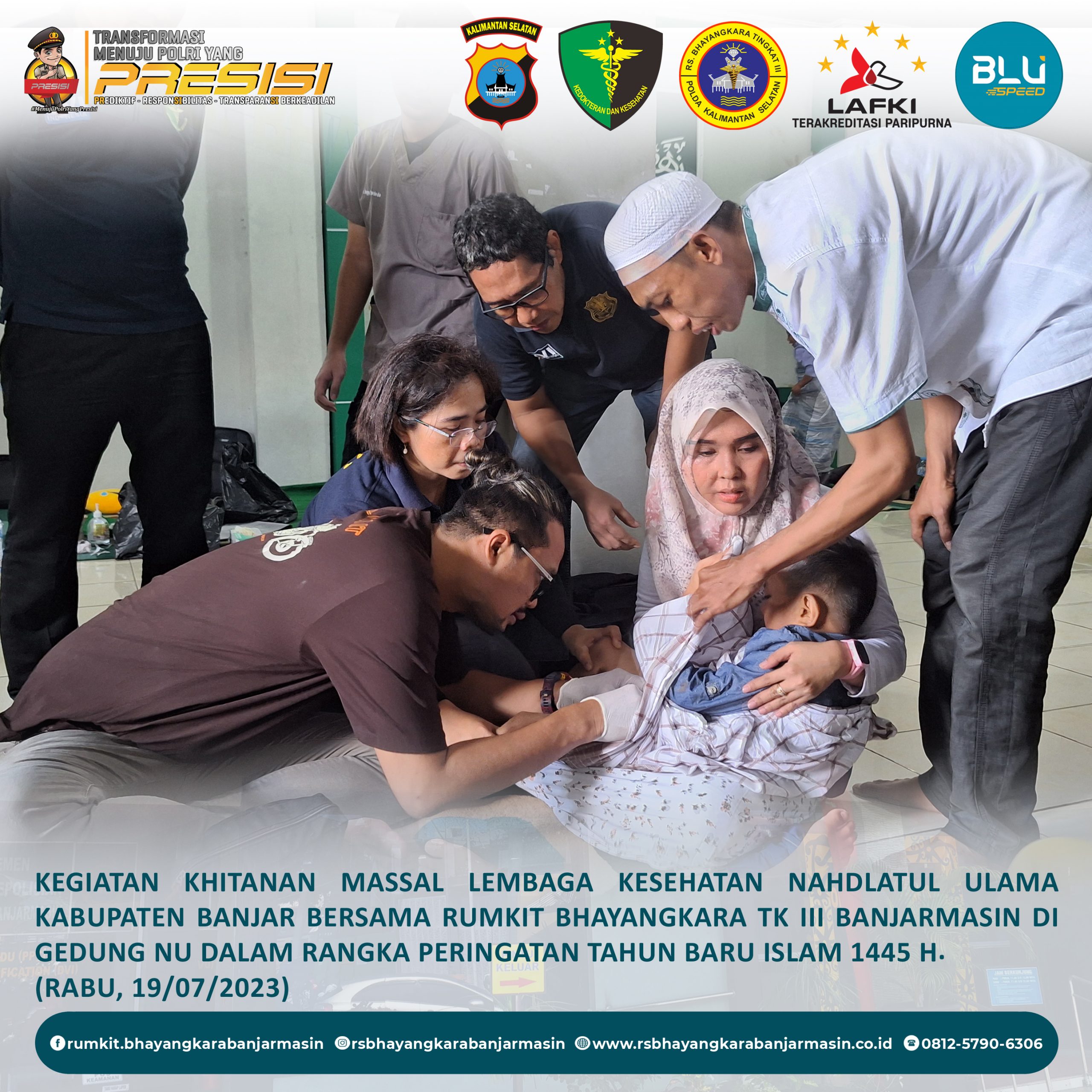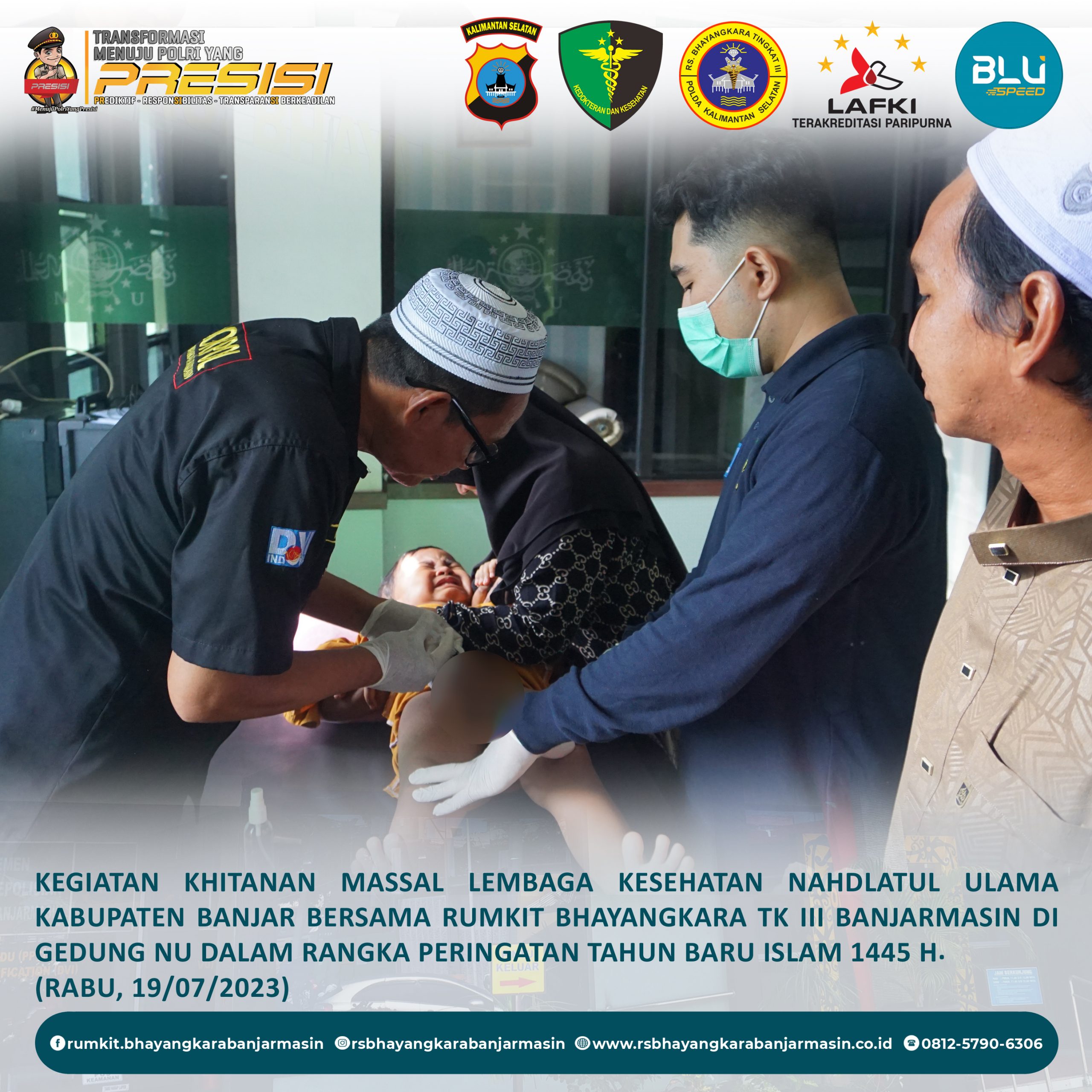 Khitanan Massal – Kegiatan Khitanan Massal Lembaga Kesehatan Nahdlatul Ulama (LKNU) & Lembaga Amil, Zakat, Infak dan Sedekah (Lazisnu) Kabupaten Banjar bersama dengan Rumah Sakit Bhayangkara Tk III Banjarmasin serta Lembaga Amil Zakat Nasional (Baznas) Kabupaten Banjar, Ikatan Dokter Indonesia Kabupaten Banjar, Persatuan Perawat Nasional Indonesia dan Tim Bantuan Medis Fakultas Kedokteran ULM di gedung NU Kabupaten Banjar dalam rangka tahun baru Islam 1444 Hijriah.