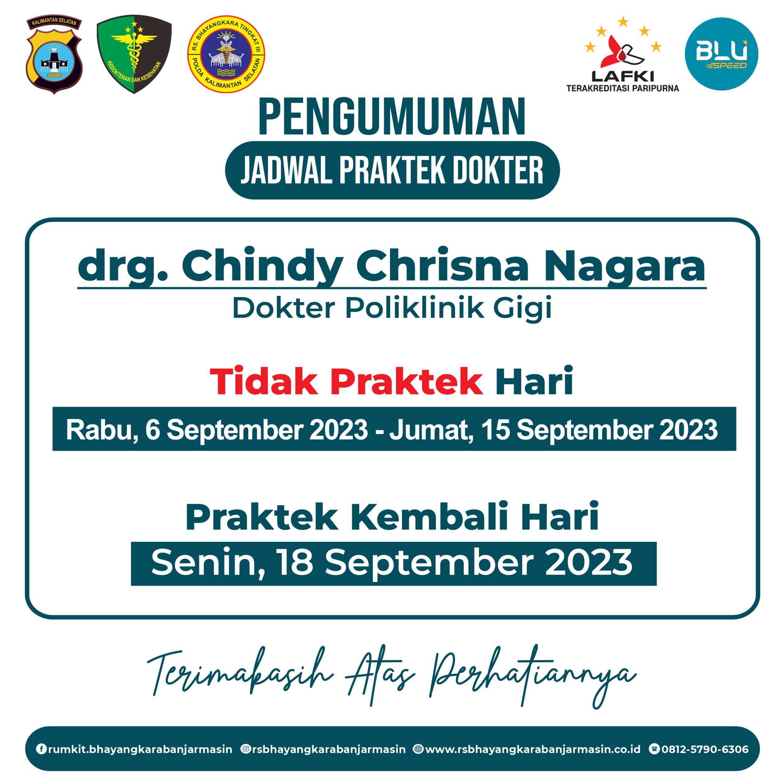 Pengumuman Jadwal Praktek Dokter Gigi drg, Chindy Chrisna Nagara di Rumkit Bhayangkara Tk III Banjarmasin