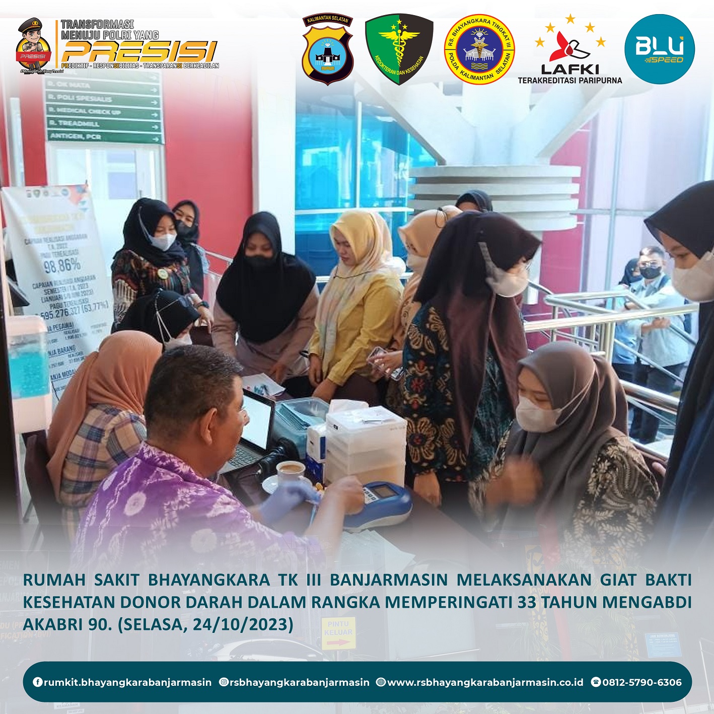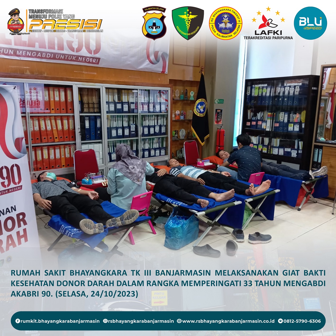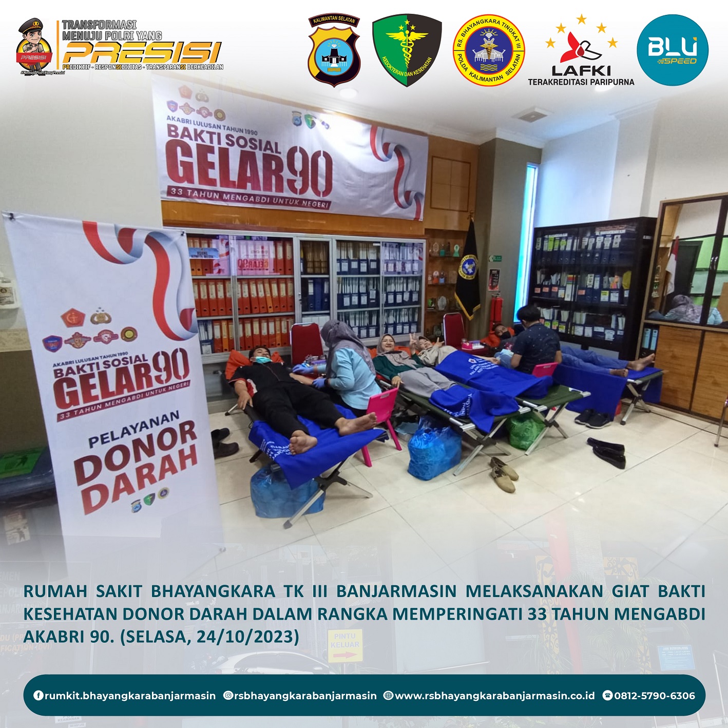 AKABRI 90 – Giat bakti kesehatan donor darah dalam rangka memperingati 33 tahun mengabdi Akabri 90 di Aula Rumit Bhayangkara Tk III Banjarmasin.