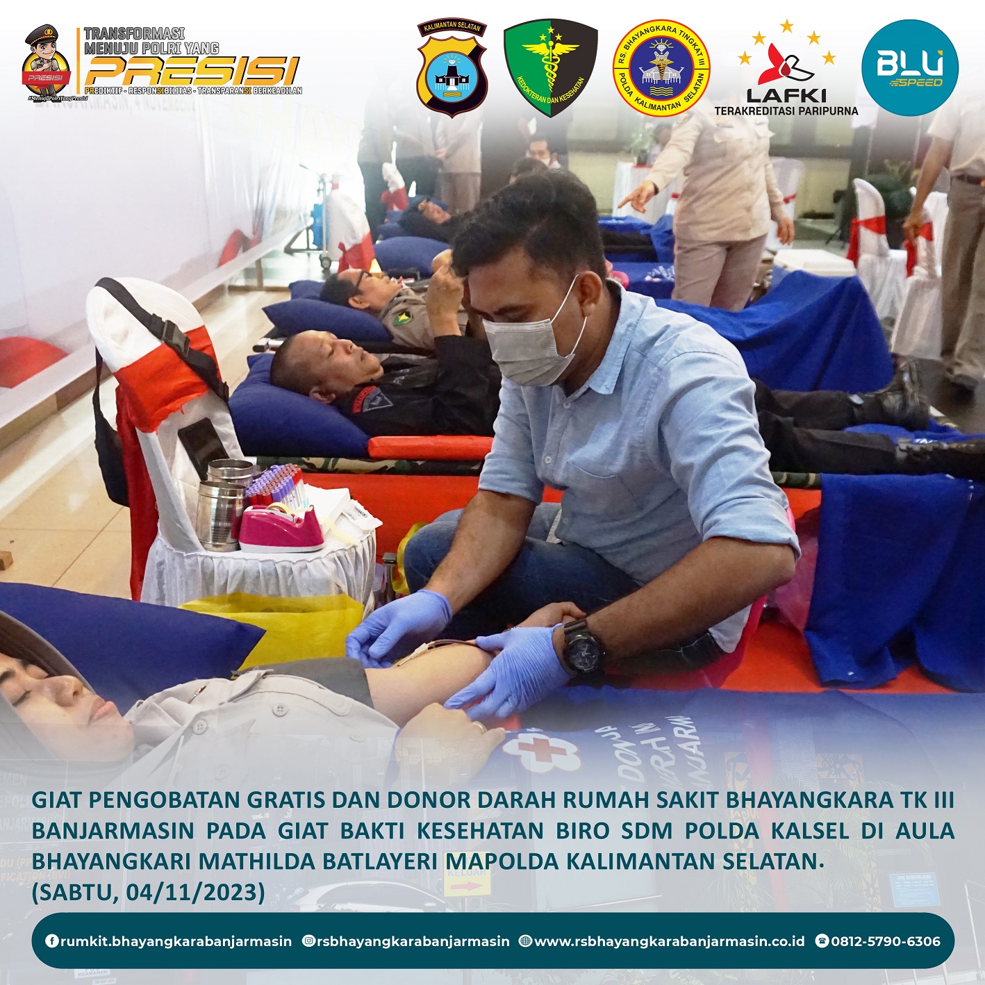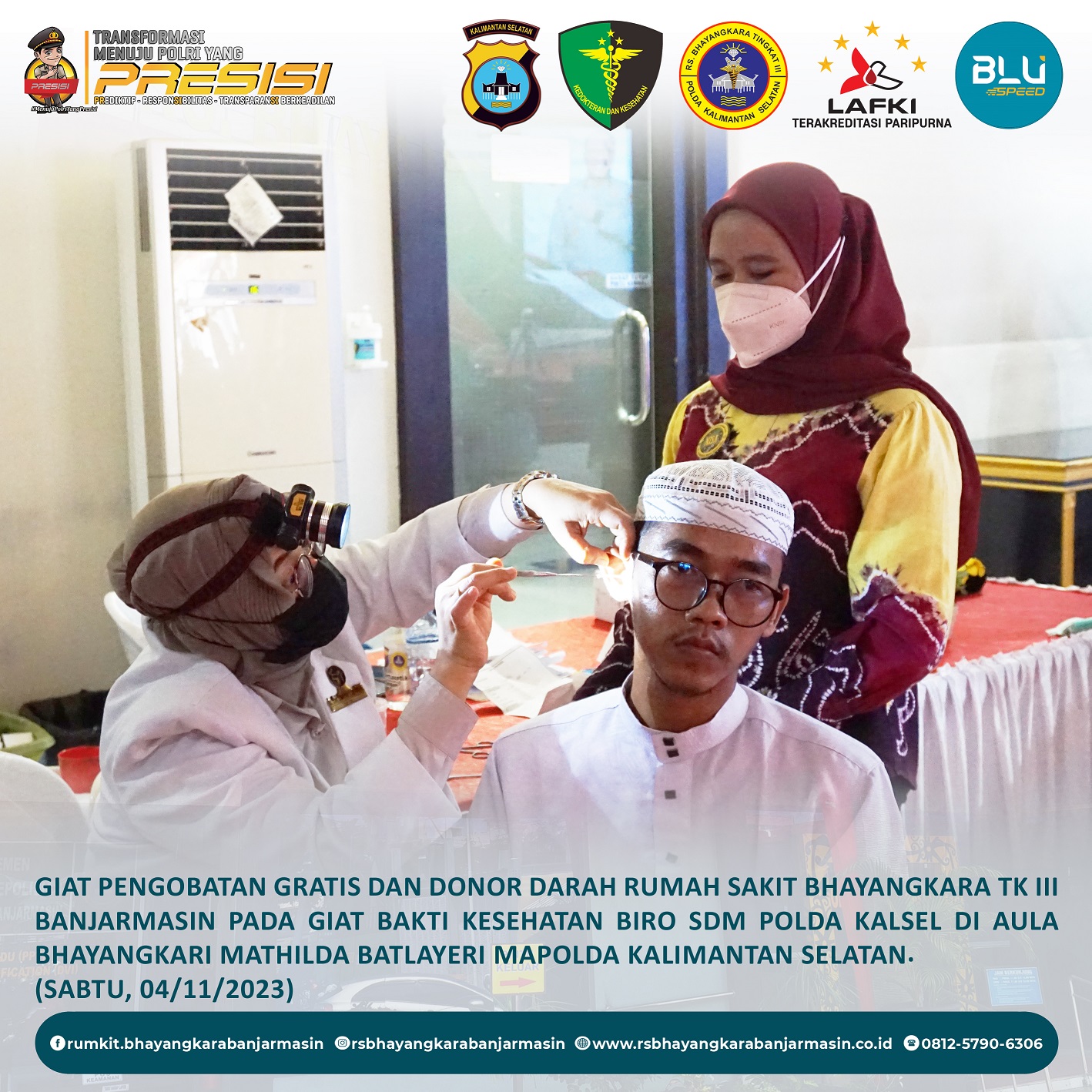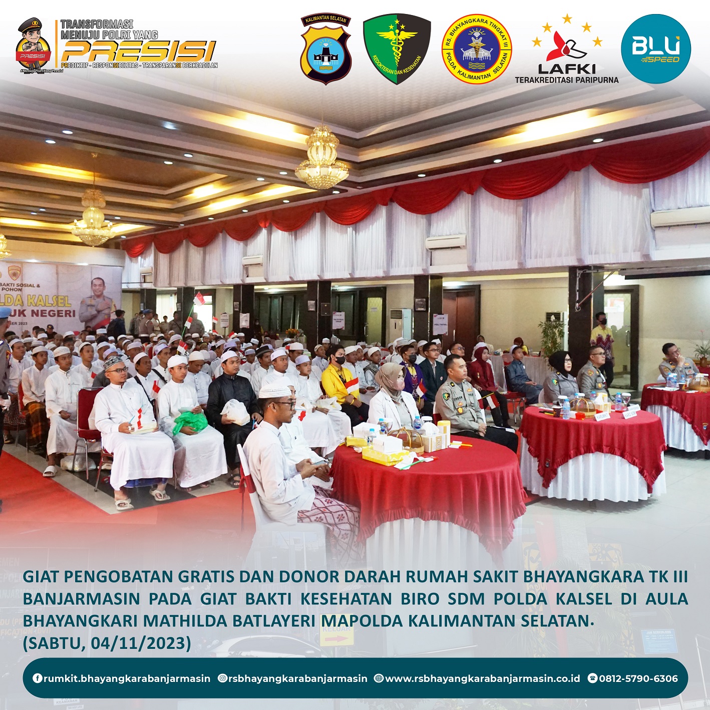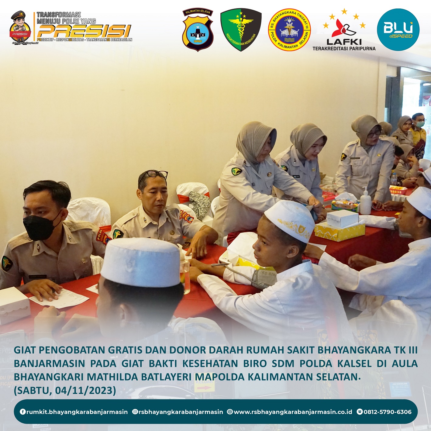 Bakti Kesehatan SDM Polri – Giat pengobatan gratis dan donor darah Rumkit Bhayangkara Tk III Banjarmasin kepada santri & santriwati pesantren pada giat Bakti Kesehatan Biro SDM POLDA KALSEL di Aula Bhayangkari Mathilda Batlayeri Mapolda Kalimantan Selatan.