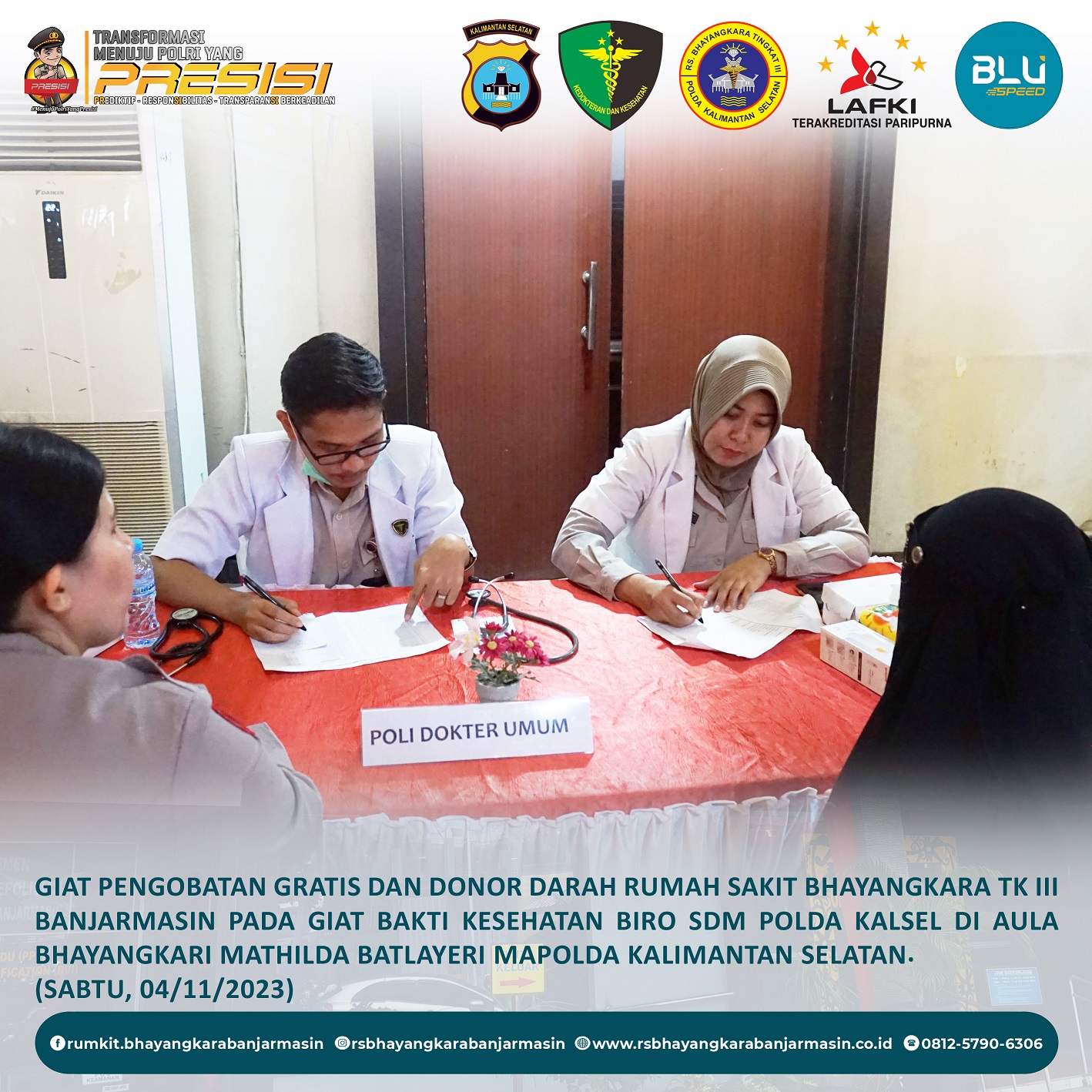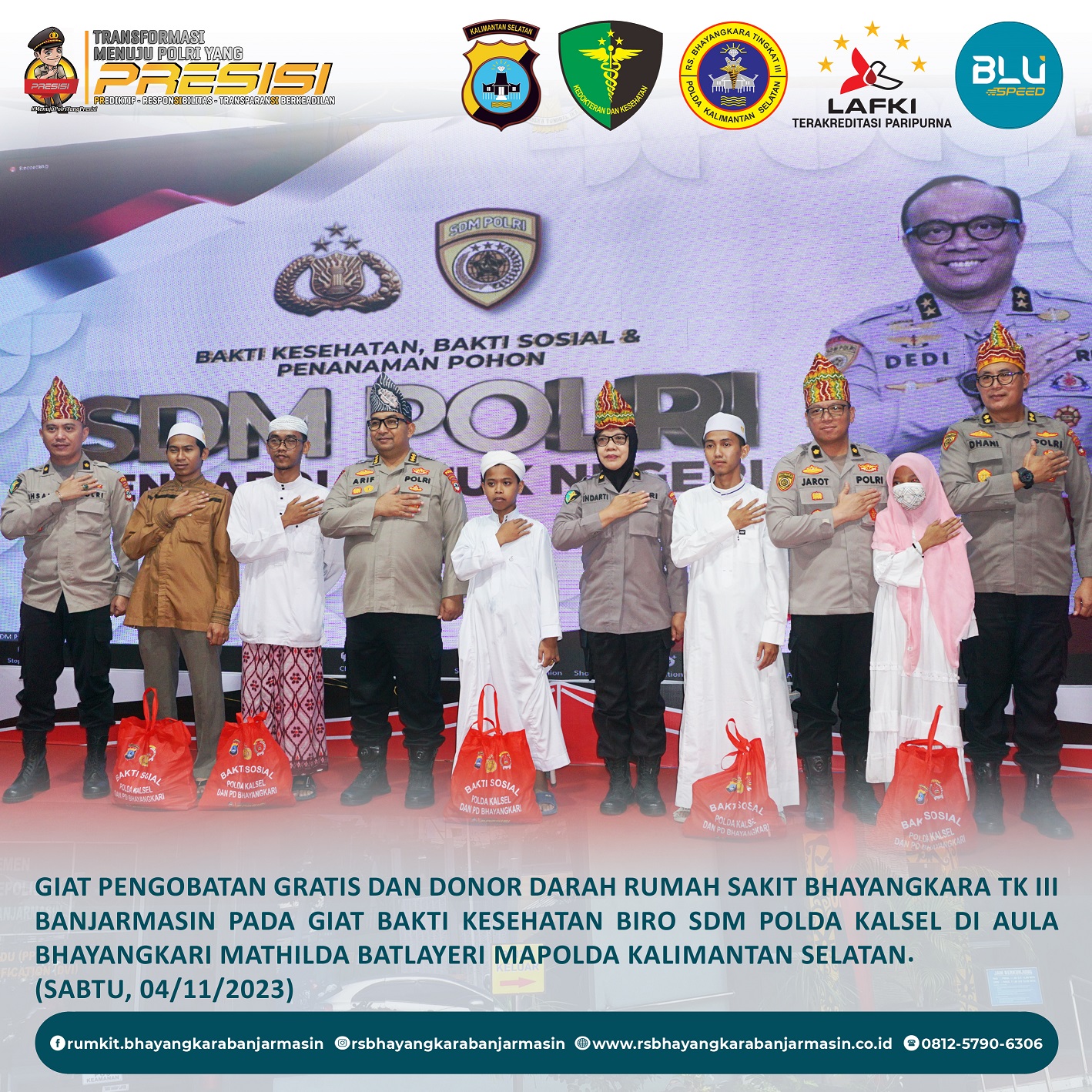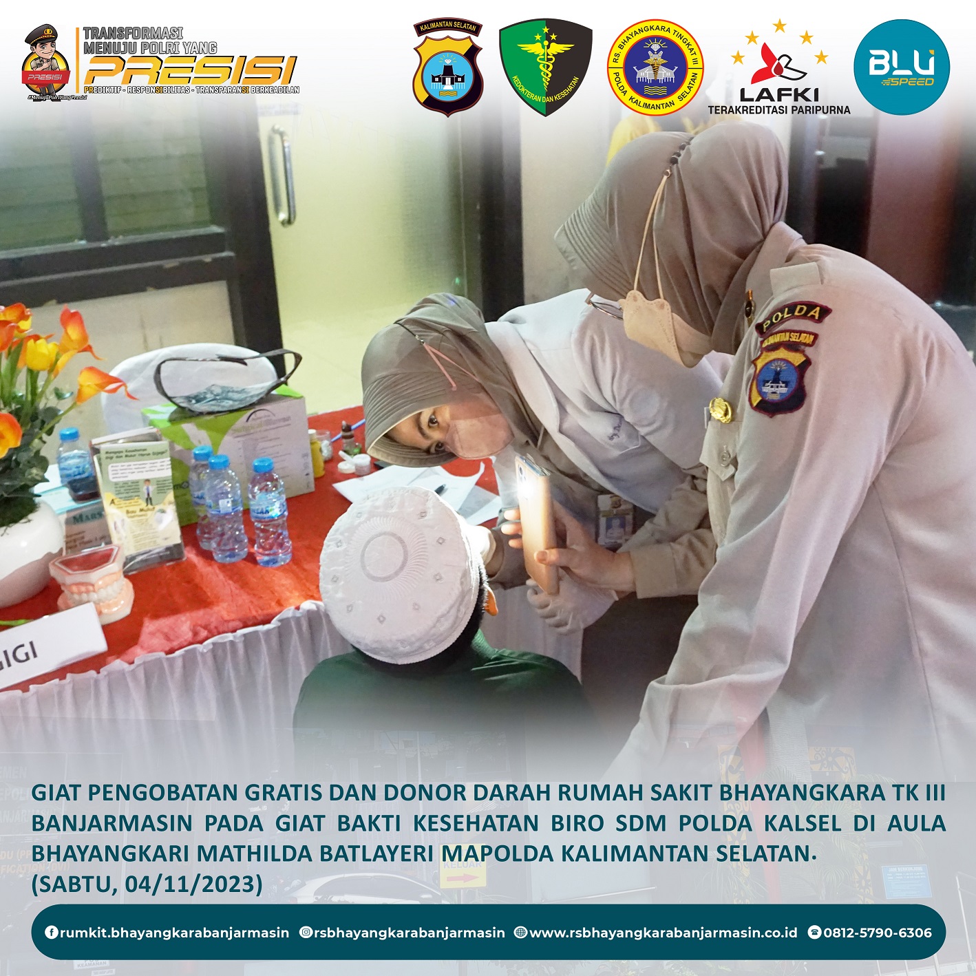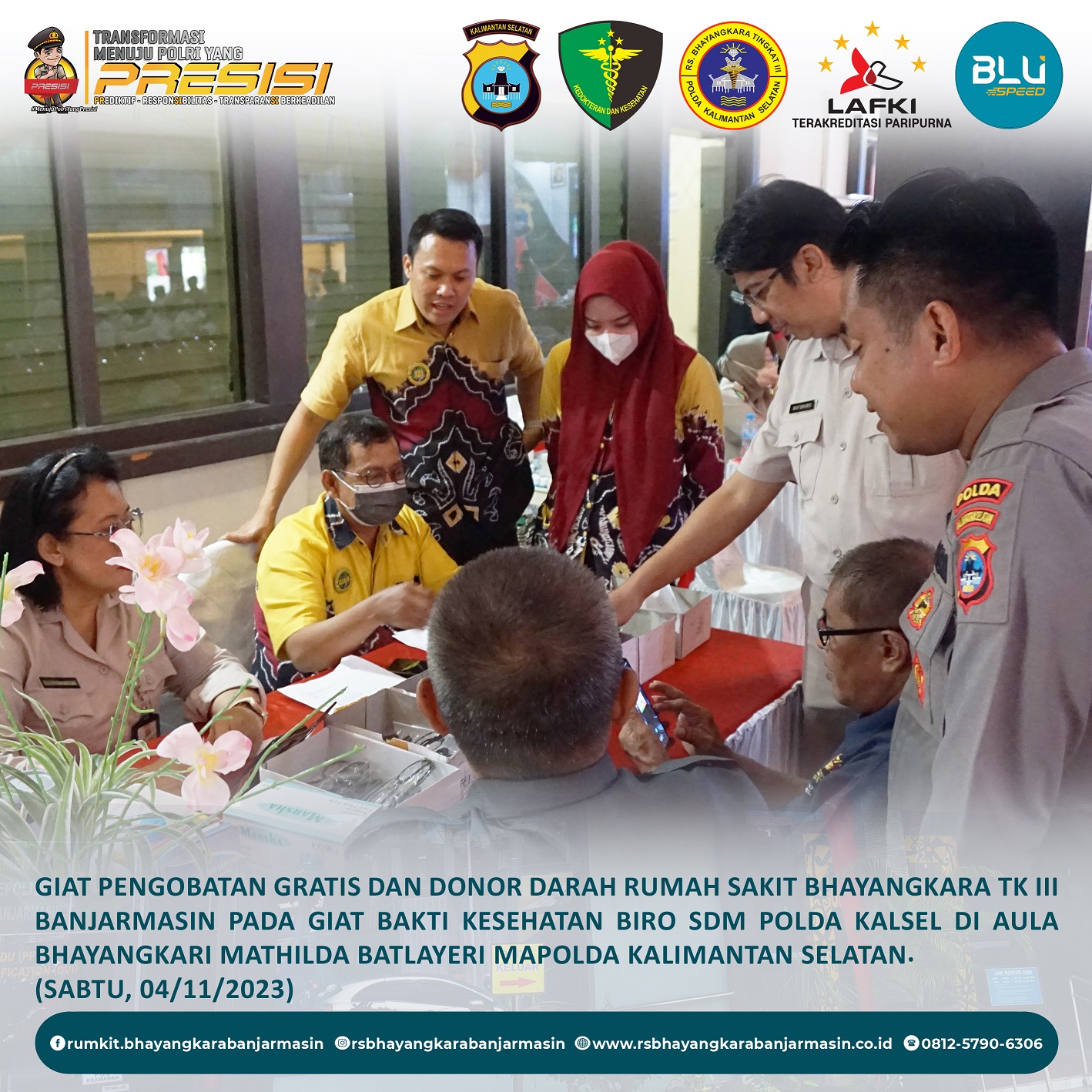 Bakti Kesehatan SDM Polri – Giat pengobatan gratis dan donor darah Rumkit Bhayangkara Tk III Banjarmasin kepada santri & santriwati pesantren pada giat Bakti Kesehatan Biro SDM POLDA KALSEL di Aula Bhayangkari Mathilda Batlayeri Mapolda Kalimantan Selatan.