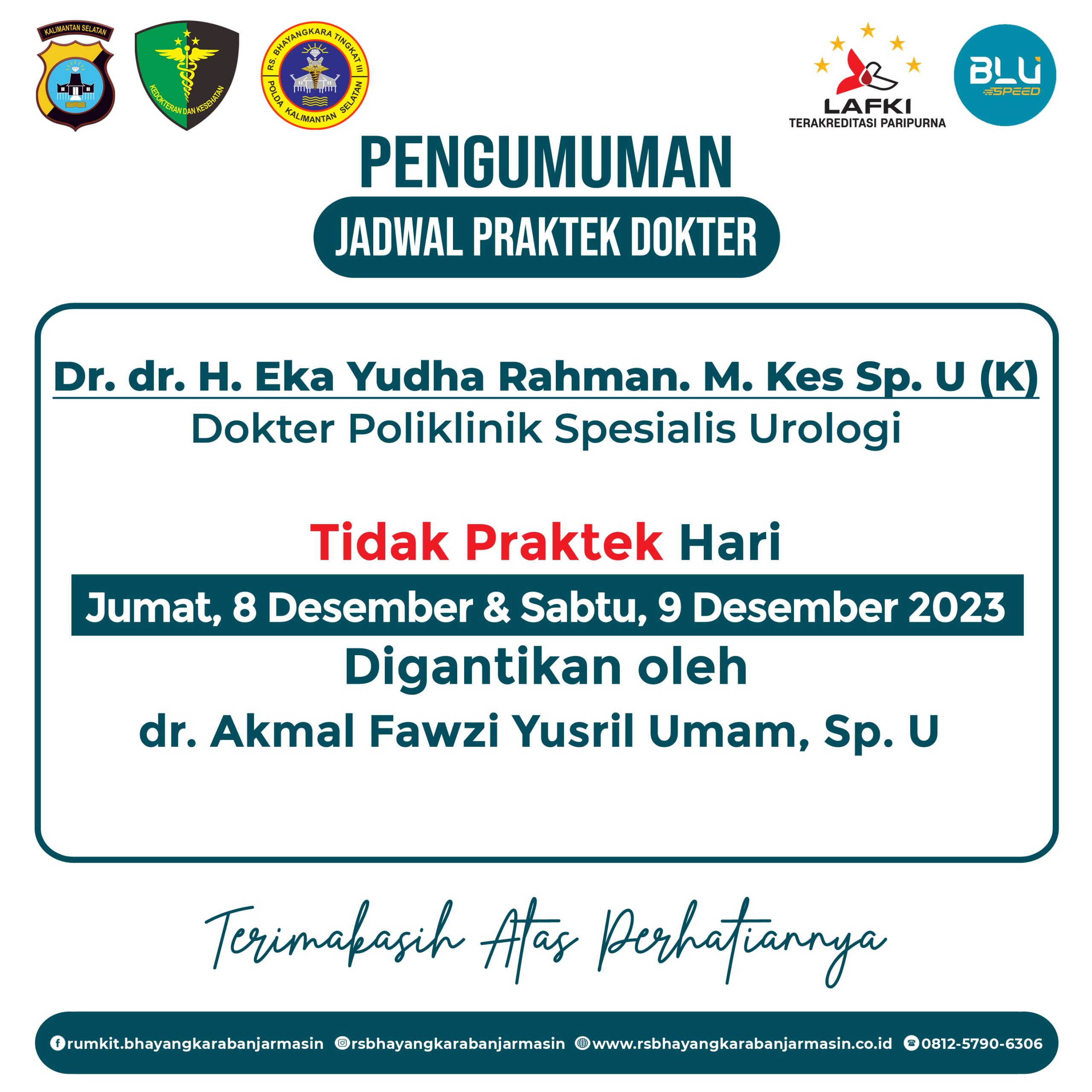 Perubahan sementara jadwal dokter spesialis Urologi Rumkit Bhayangkara Tk III Banjarmasin