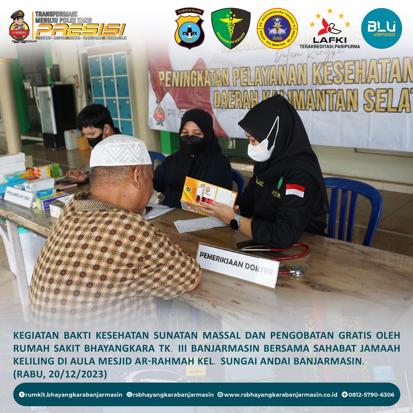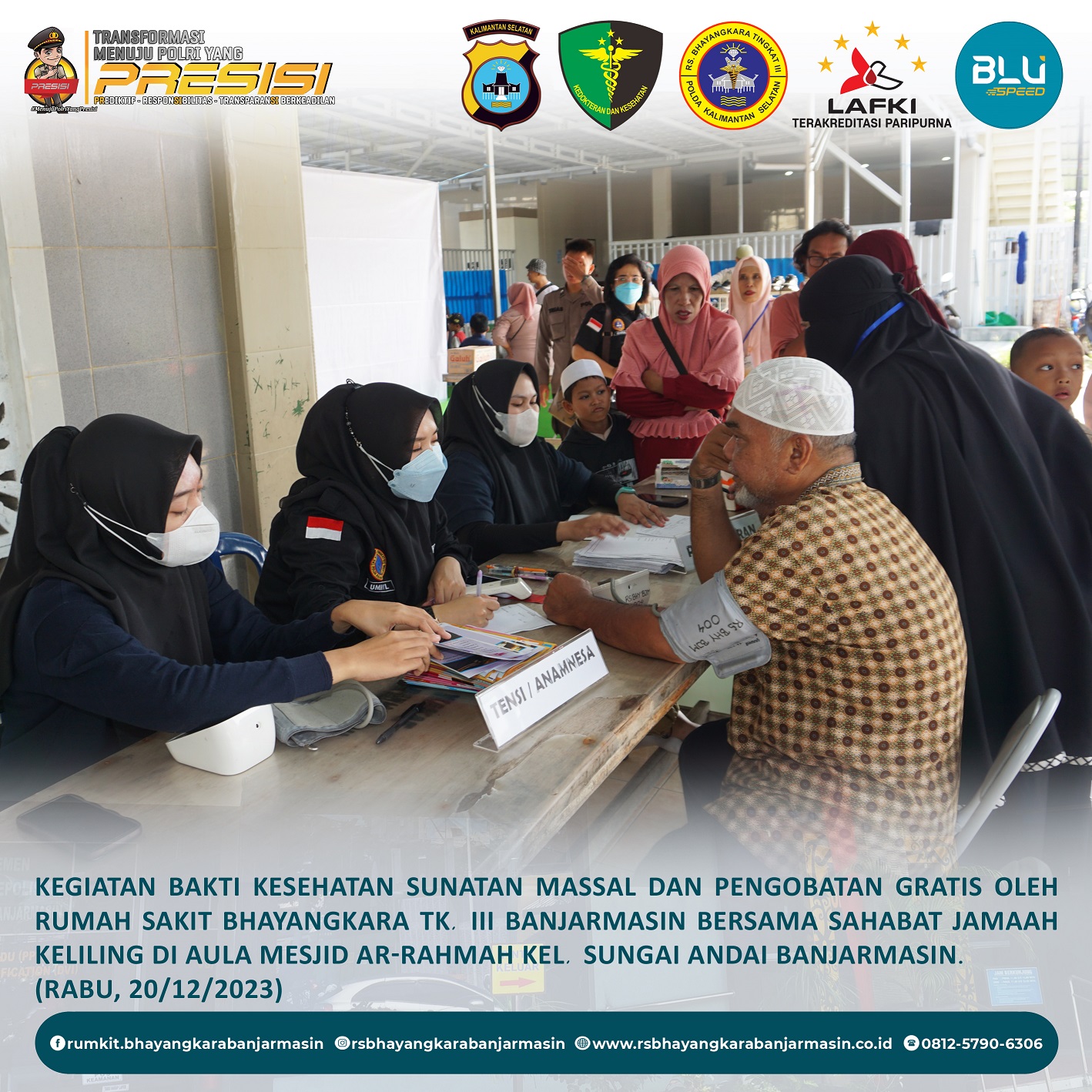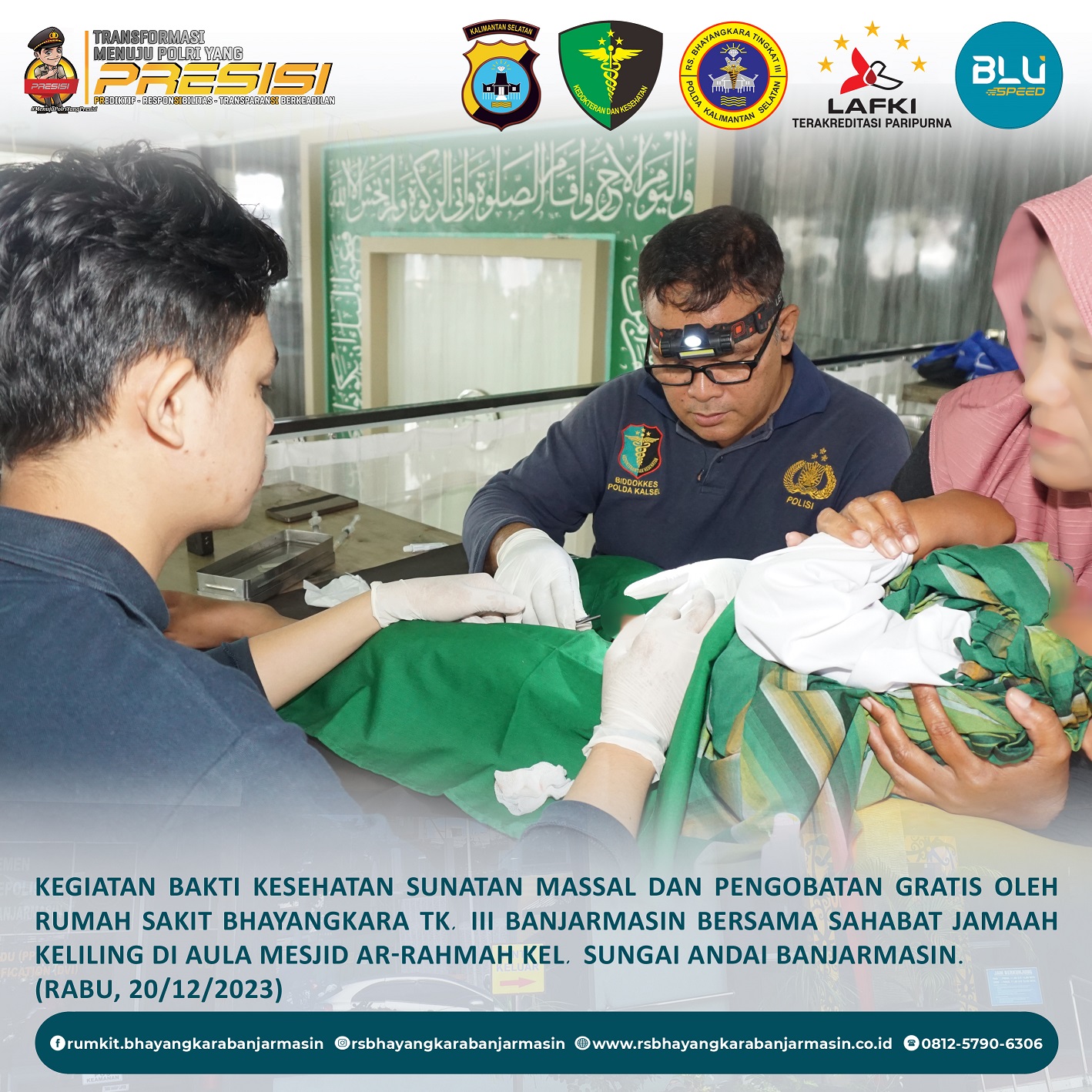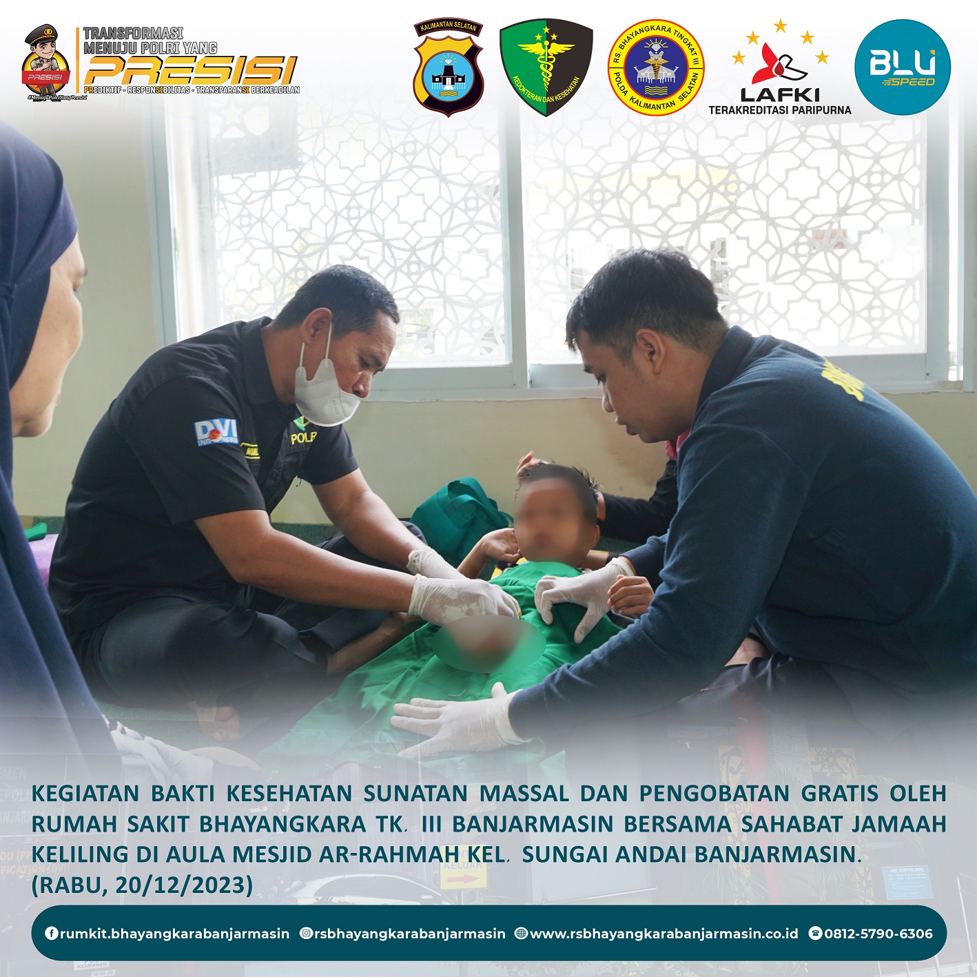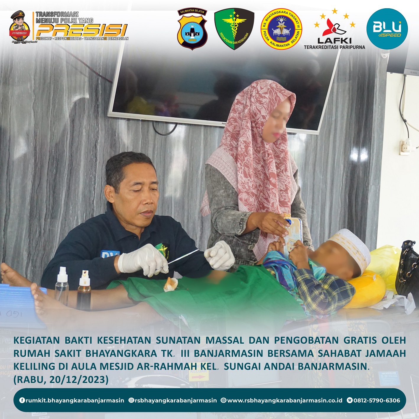 Baktikes Polri – Giat Baktikes Sunatan Massal dan Pengobatan Gratis oleh Rumkit Bhayangkara Tk. III Banjarmasin bersama Sahabat Jamaah Keliling di Aula Mesjid Ar-Rahmah kel. Sungai Andai Banjarmasin.
