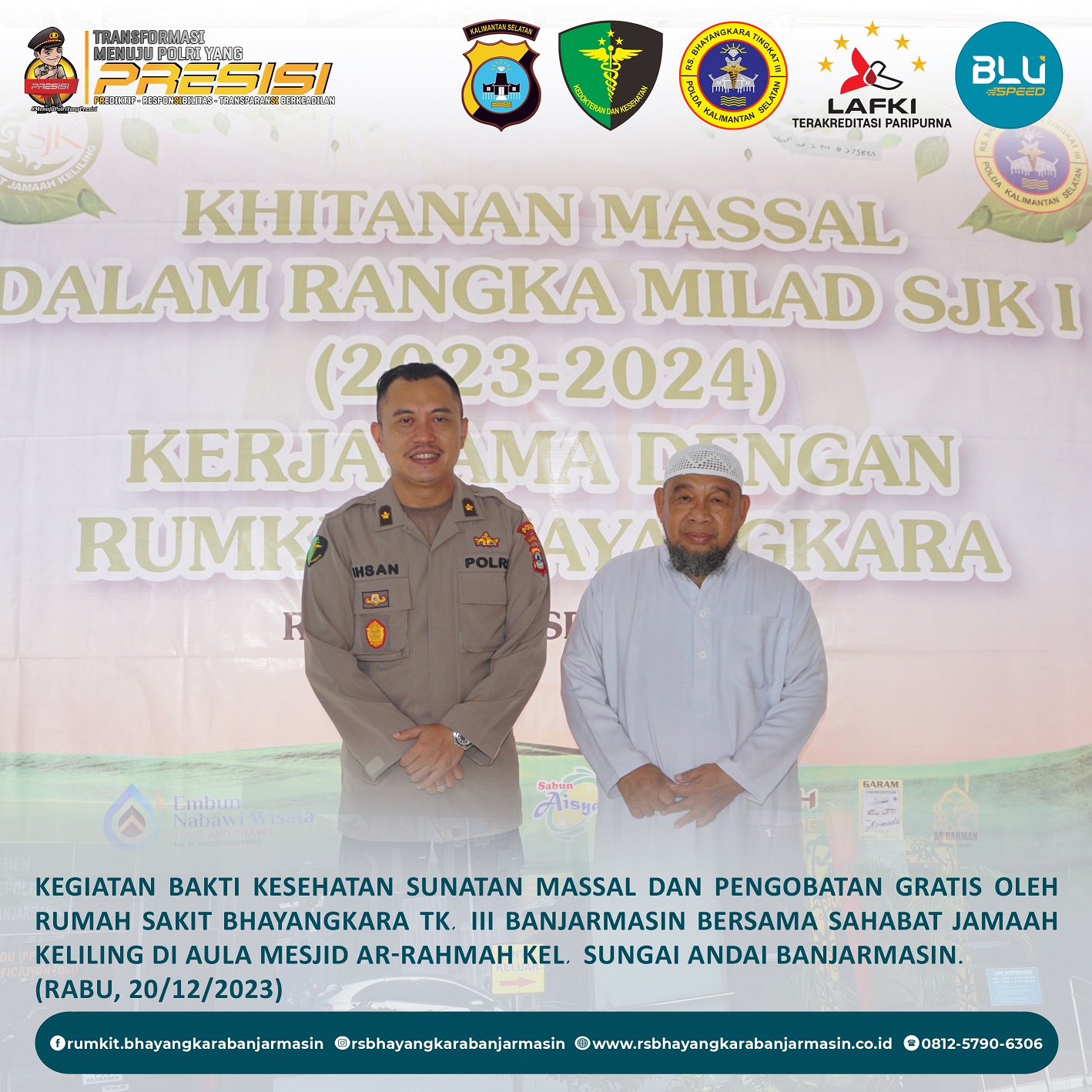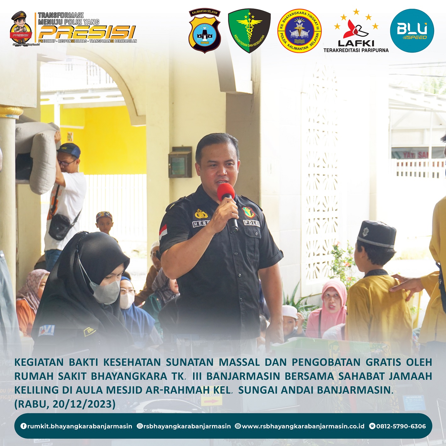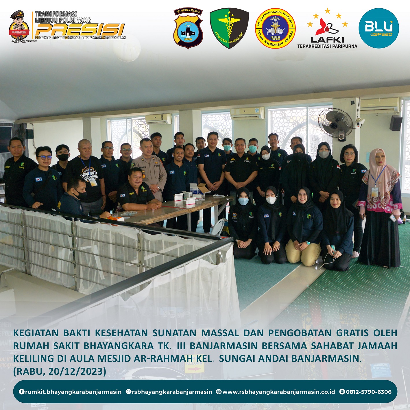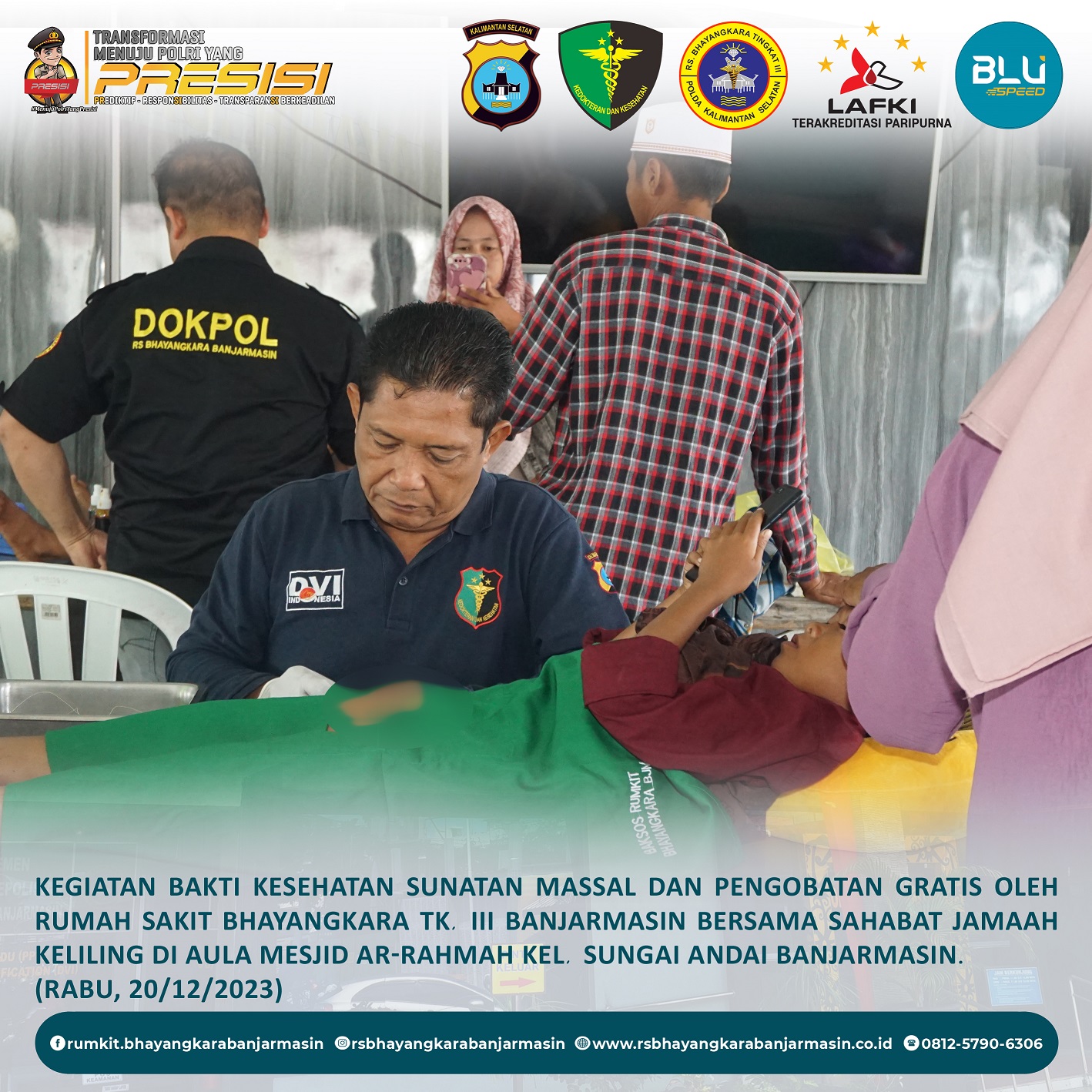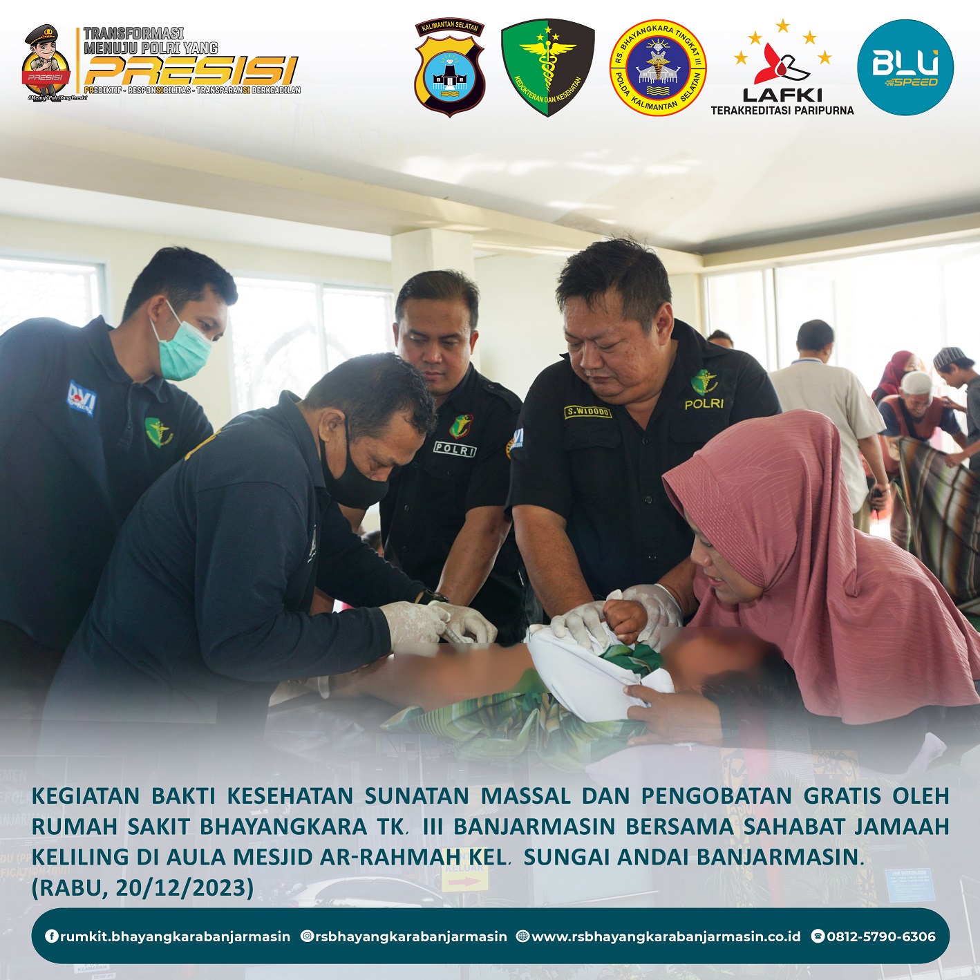 Baktikes Polri – Giat Baktikes Sunatan Massal dan Pengobatan Gratis oleh Rumkit Bhayangkara Tk. III Banjarmasin bersama Sahabat Jamaah Keliling di Aula Mesjid Ar-Rahmah kel. Sungai Andai Banjarmasin.