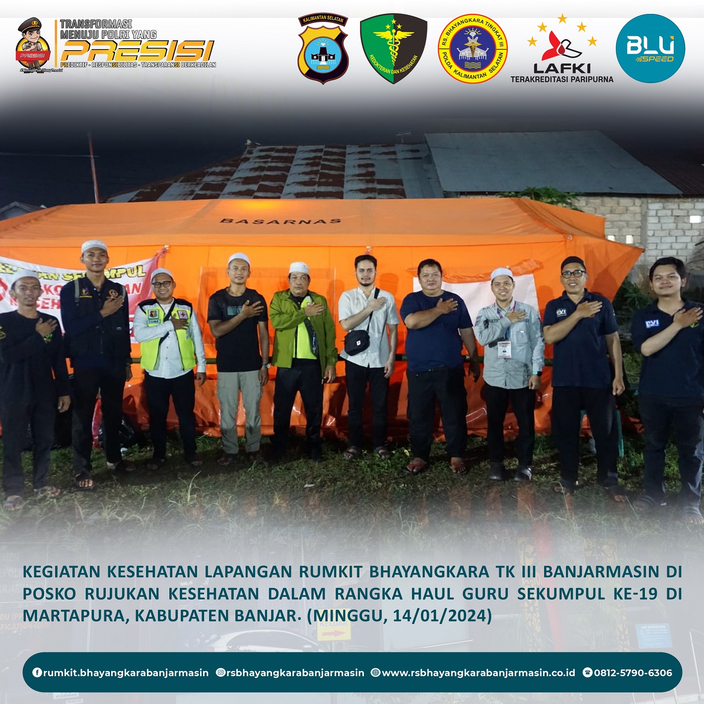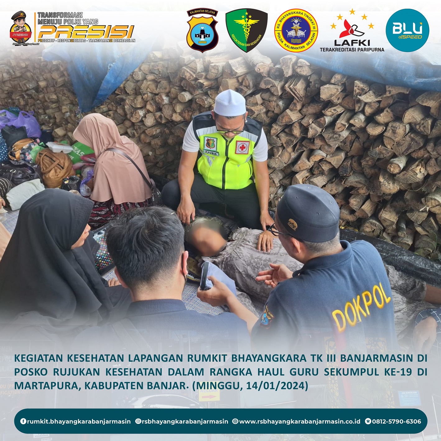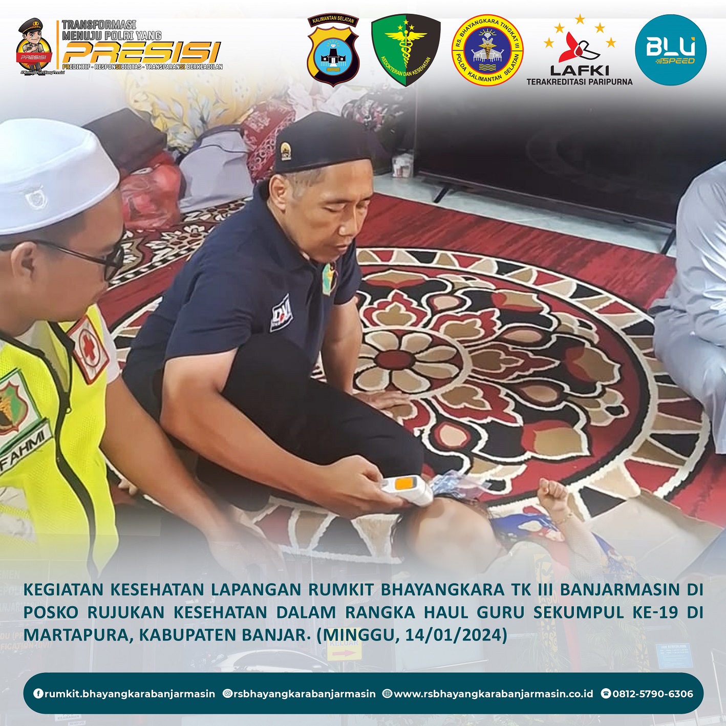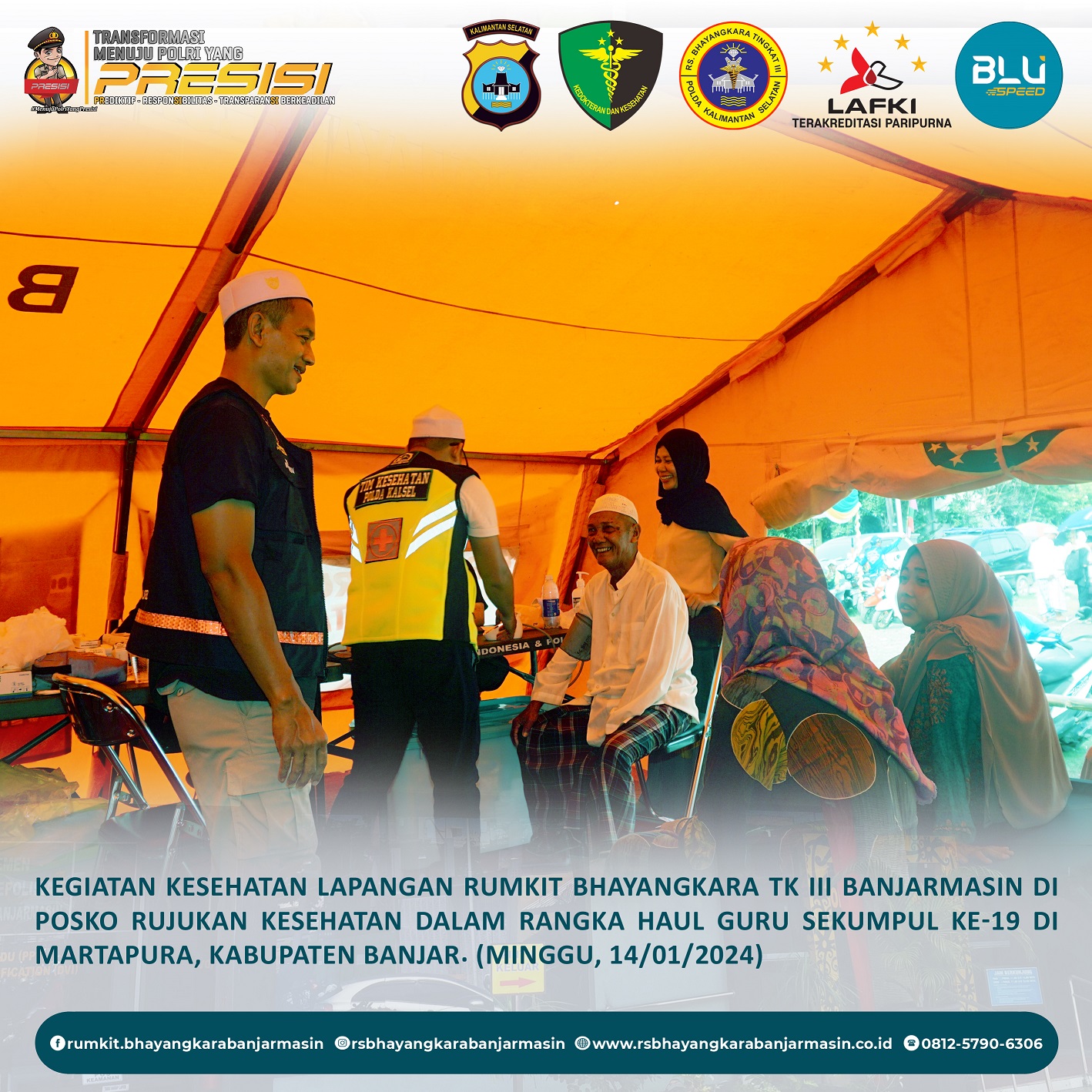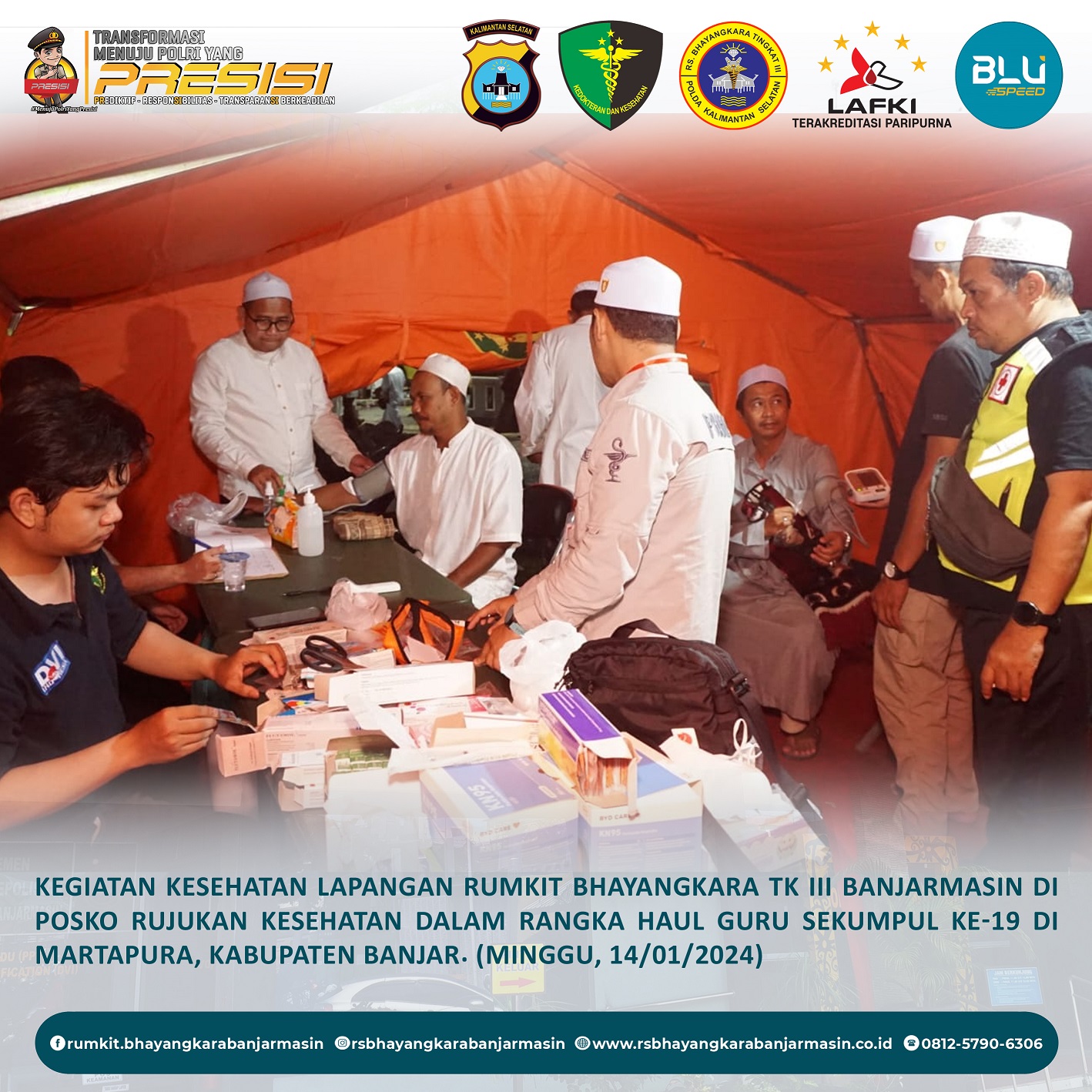 Kesehatan Lapangan – Kegiatan Kesehatan Lapangan Rumah Sakit Bhayangkara Tk III Banjarmasin di Posko Rujukan Kesehatan di Gang Soewardi Sekumpul dalam Rangka Acara Haul Guru Sekumpul ke-19 di Martapura, Kabupaten Banjar.