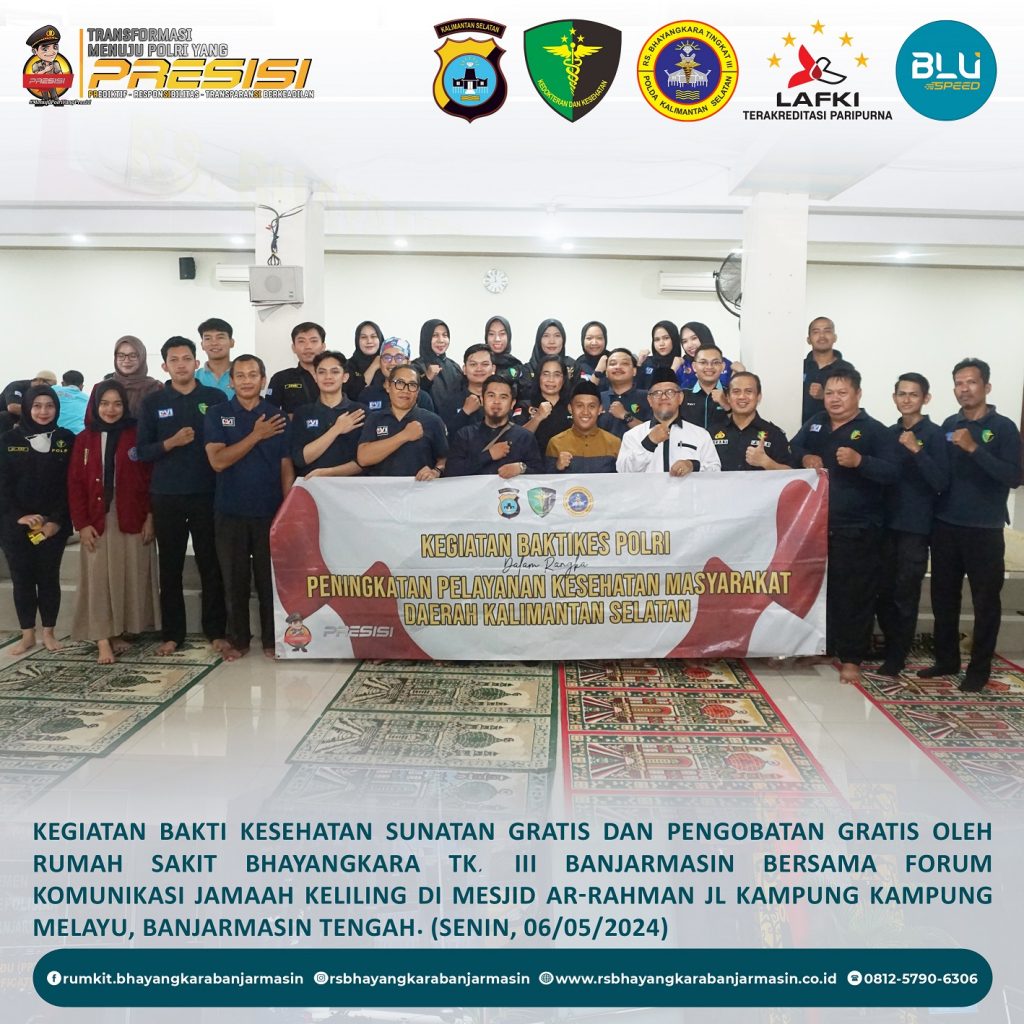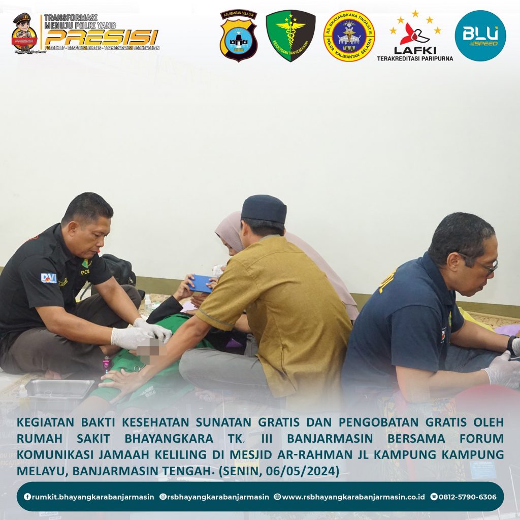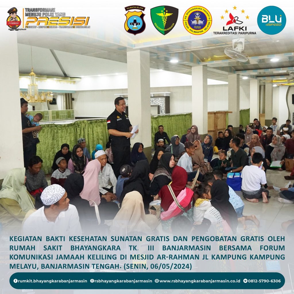 Bakti Kesehatan – Giat Baktikes Sunatan Massal dan Pengobatan Gratis oleh Rumkit Bhayangkara Tk. III Banjarmasin di Mesjid Ar-Rahman Jl. Kampung Melayu Banjarmasin Tengah.
