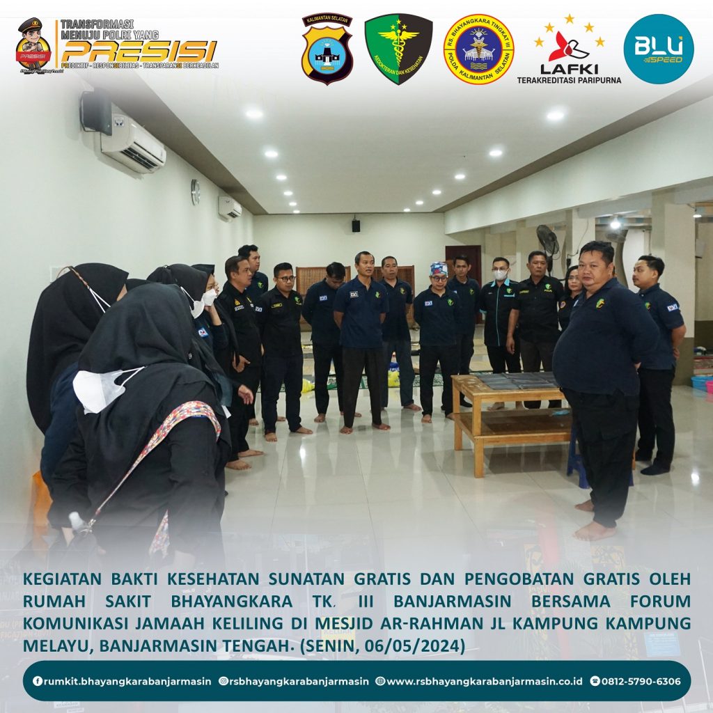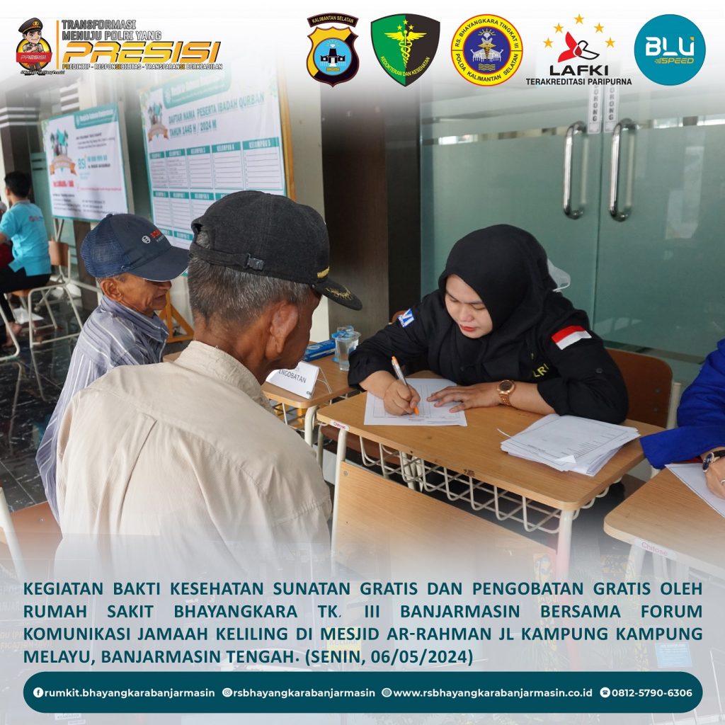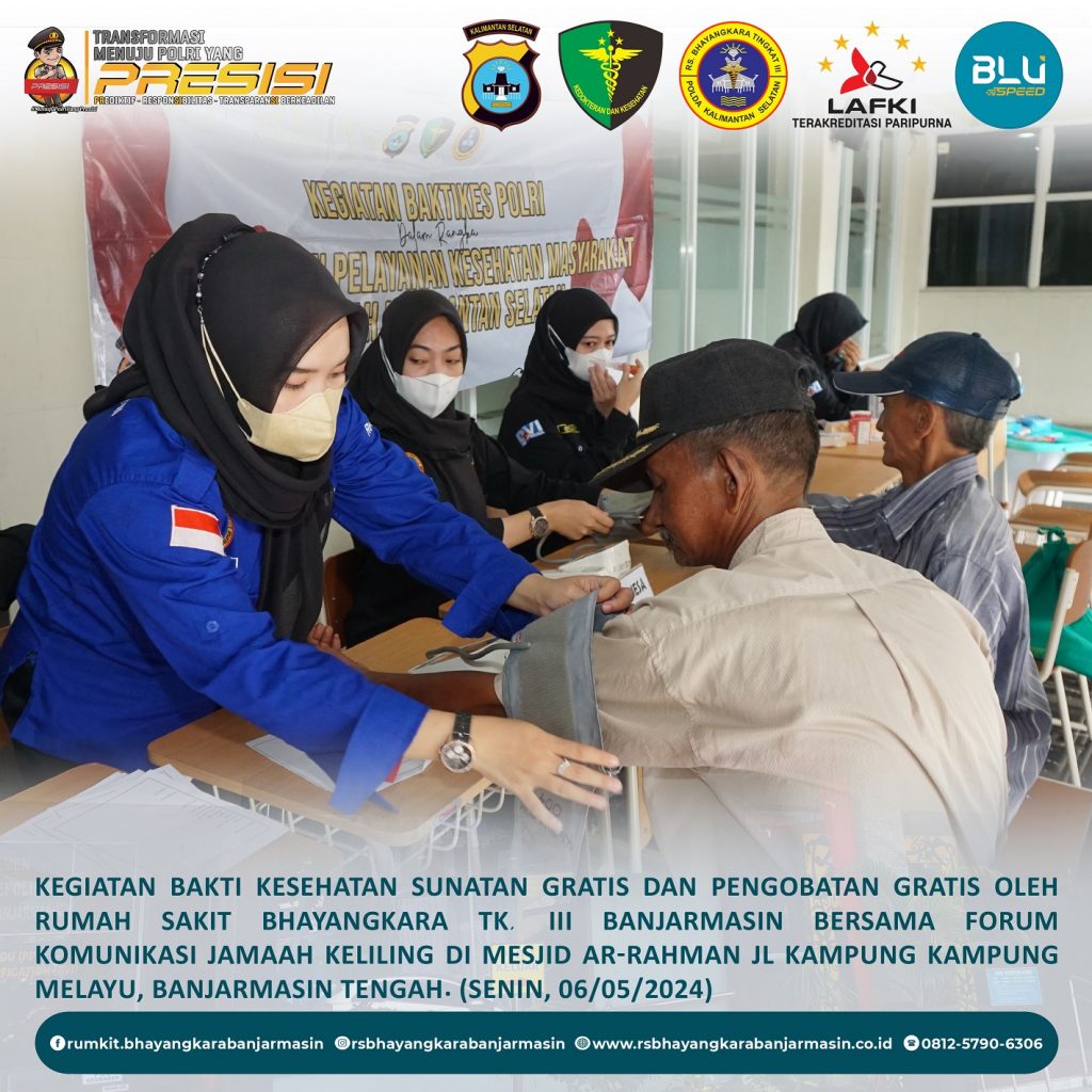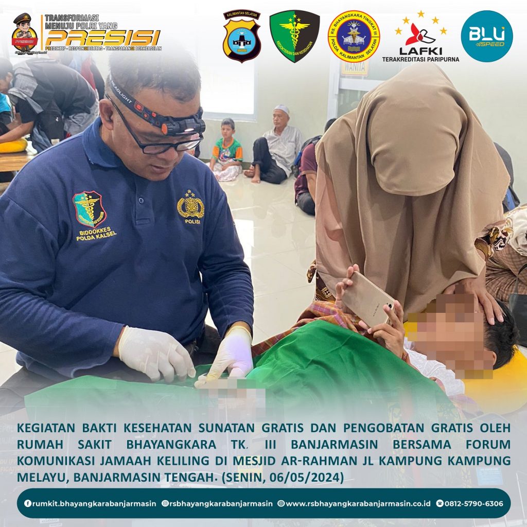 Bakti Kesehatan – Giat Baktikes Sunatan Massal dan Pengobatan Gratis oleh Rumkit Bhayangkara Tk. III Banjarmasin di Mesjid Ar-Rahman Jl. Kampung Melayu Banjarmasin Tengah.