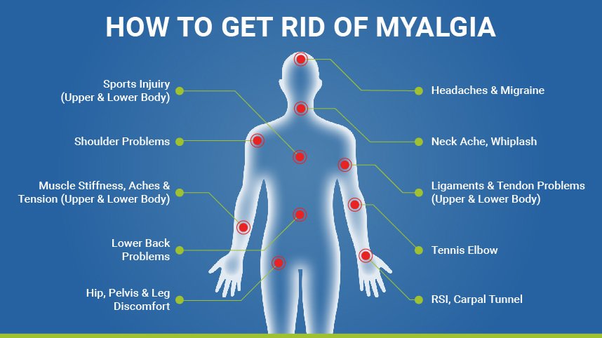Gejala umum myalgia adalah rasa nyeri atau tidak nyaman pada otot. Selain disebabkan oleh penyakit tertentu, nyeri otot juga dapat muncul selama atau setelah melakukan kegiatan tertentu, seperti nyeri otot pada tangan setelah mengangkat beban berat, atau nyeri otot pada leher dan punggung akibat duduk dalam posisi yang tidak benar terlalu lama.